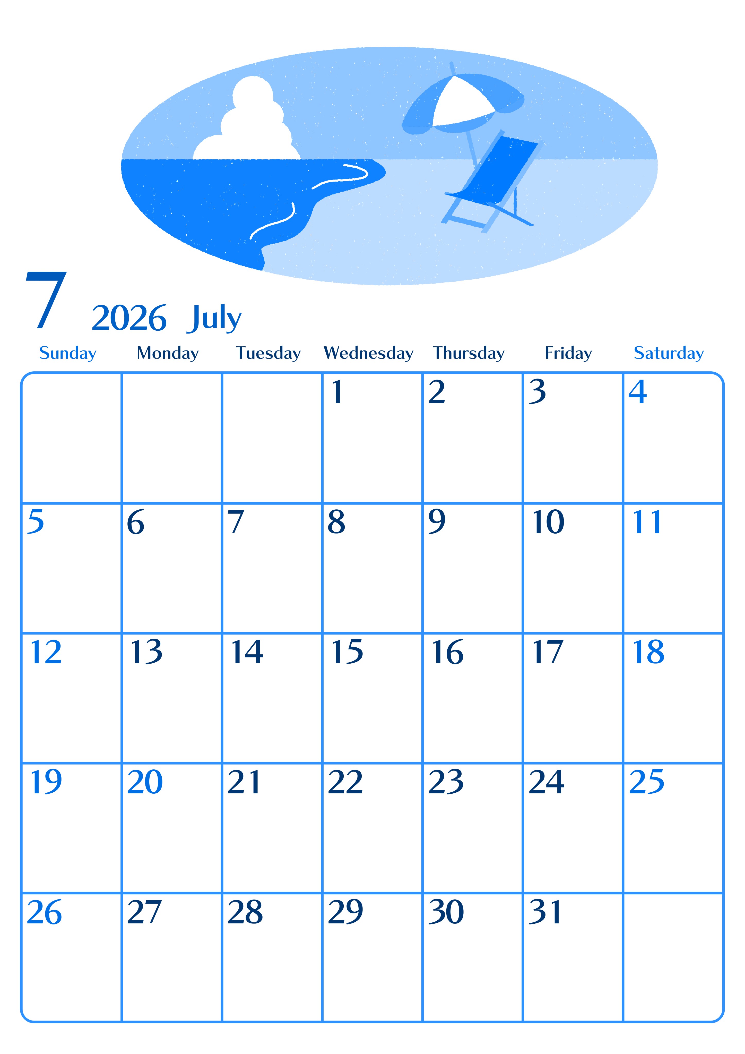2026年7月縦型日曜始まり バカンスイラストのおしゃれA4無料ブルーのカレンダー(2026-00900710)