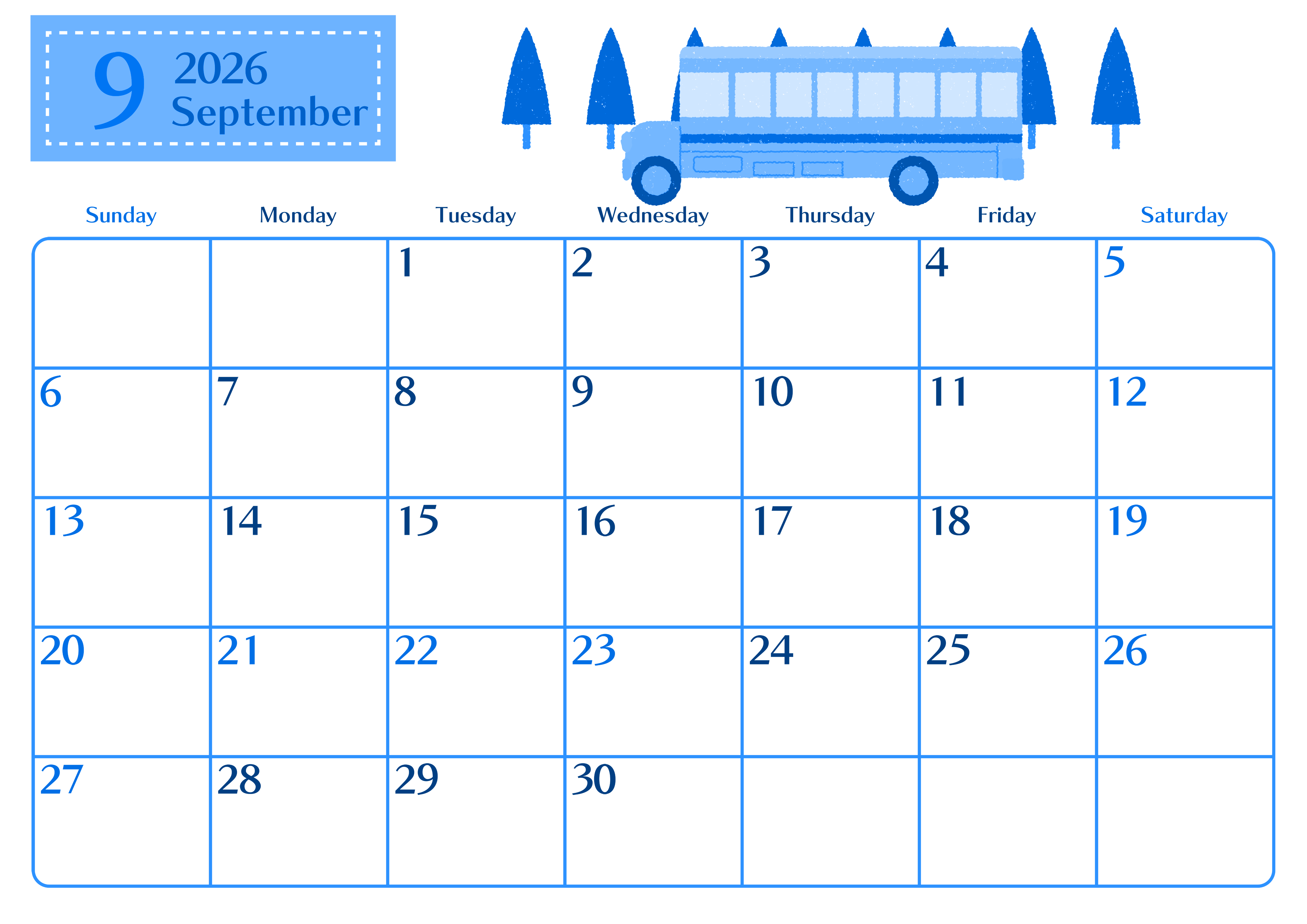 2026年9月横型日曜始まりの無料テンプレートブルーのカレンダーです。スクールバスのイラストから新学期を連想させられます。全体的におしゃれなテイストなだけでなくブルーのカレンダー部分は余白が広いので予定を書き込みやすいです。(2026-00900900)