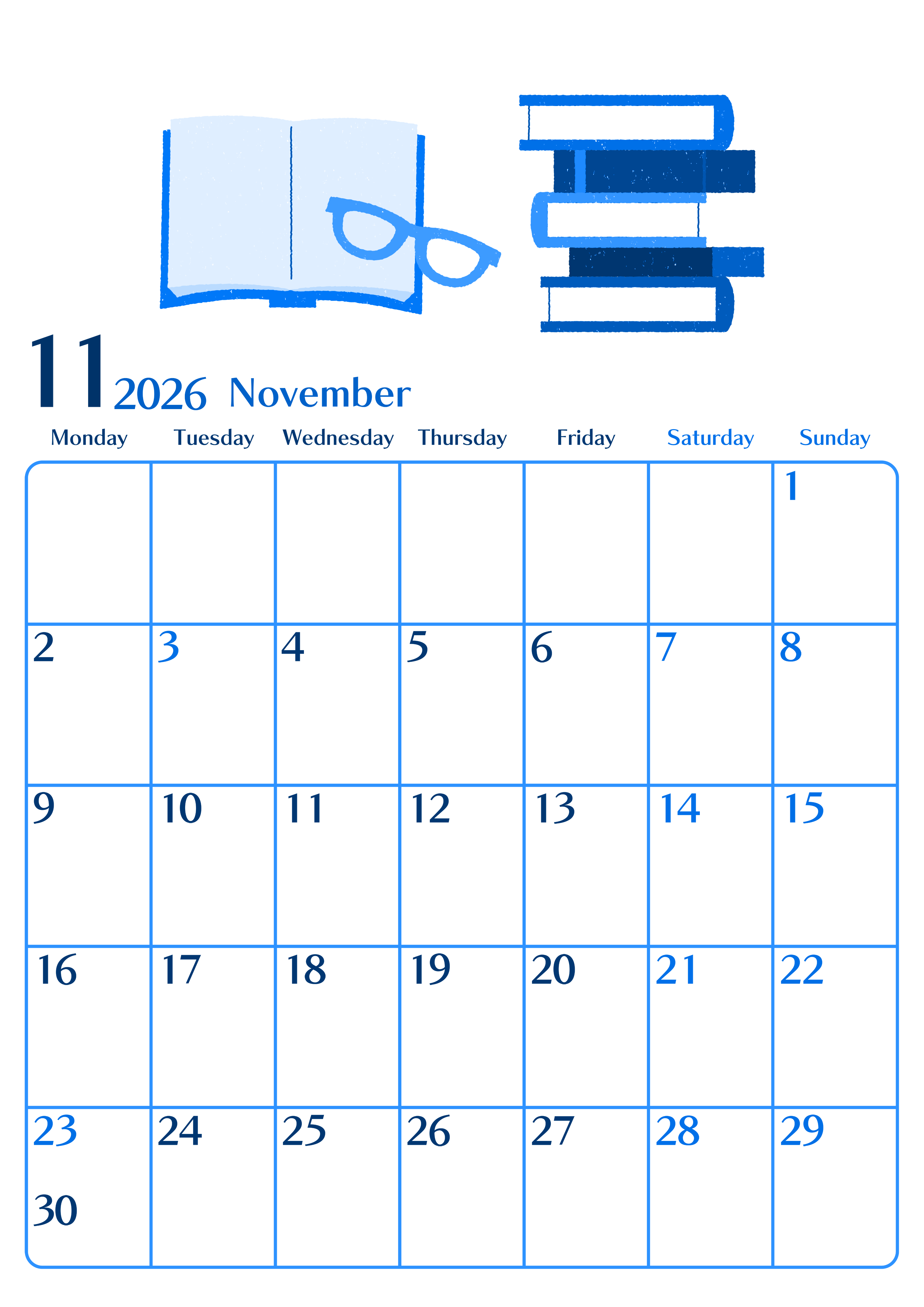 2026年11月縦型月曜始まりの無料テンプレートブルーのカレンダーです。本の読書モチーフのイラストがおしゃれで予定を書き込みやすい罫線がくっきりとしている実用性の高い縦向きのブルーのカレンダーです。(2026-00901111)