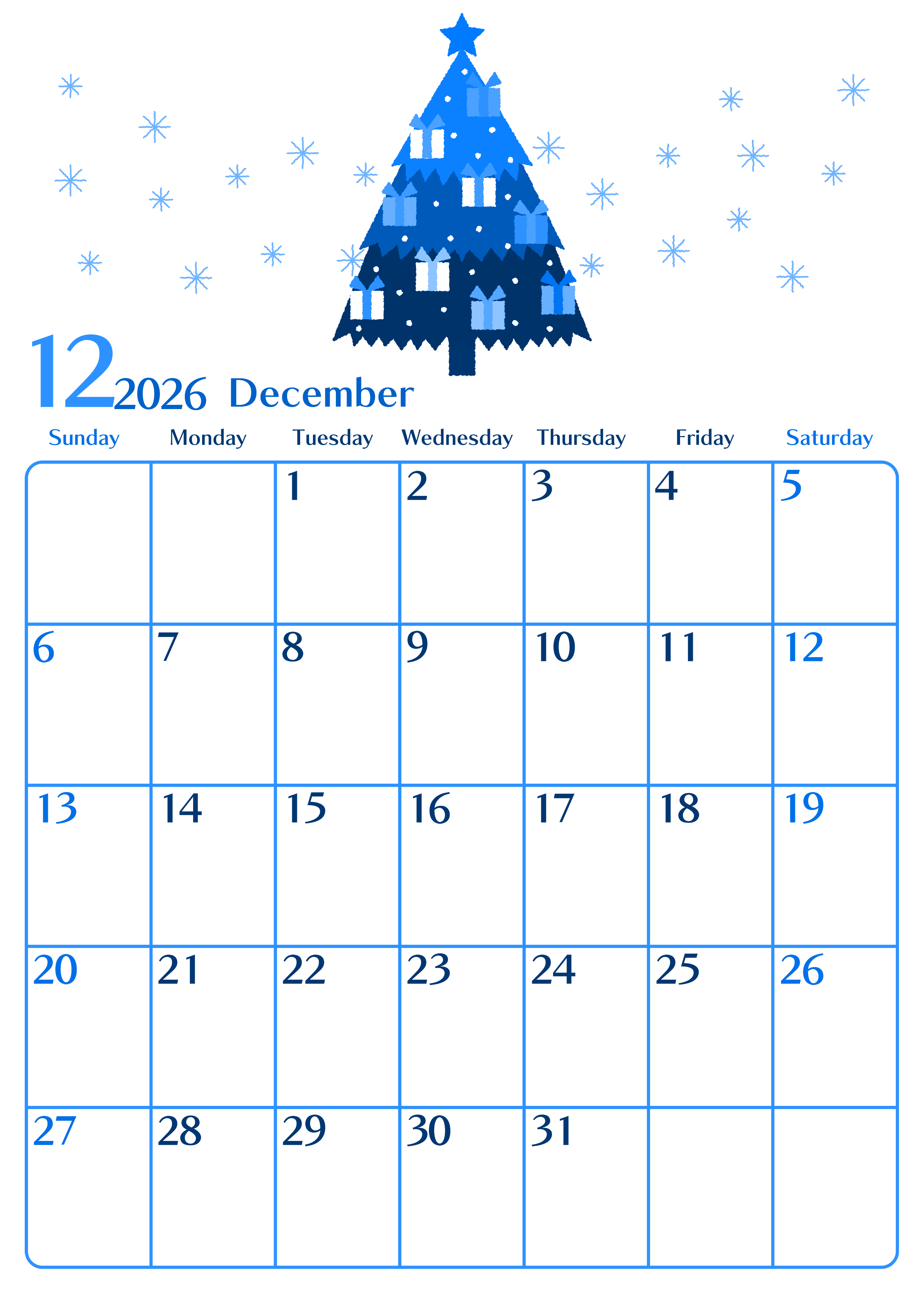 2026年12月縦型日曜始まりの無料テンプレートブルーのカレンダーです。クリスマスのワクワク感をテーマに取り上げたクリスマスツリーのイラストがおとなっぽくておしゃれな年末の予定を立てるのが楽しくなるブルーのカレンダーフリー素材です。(2026-00901210)