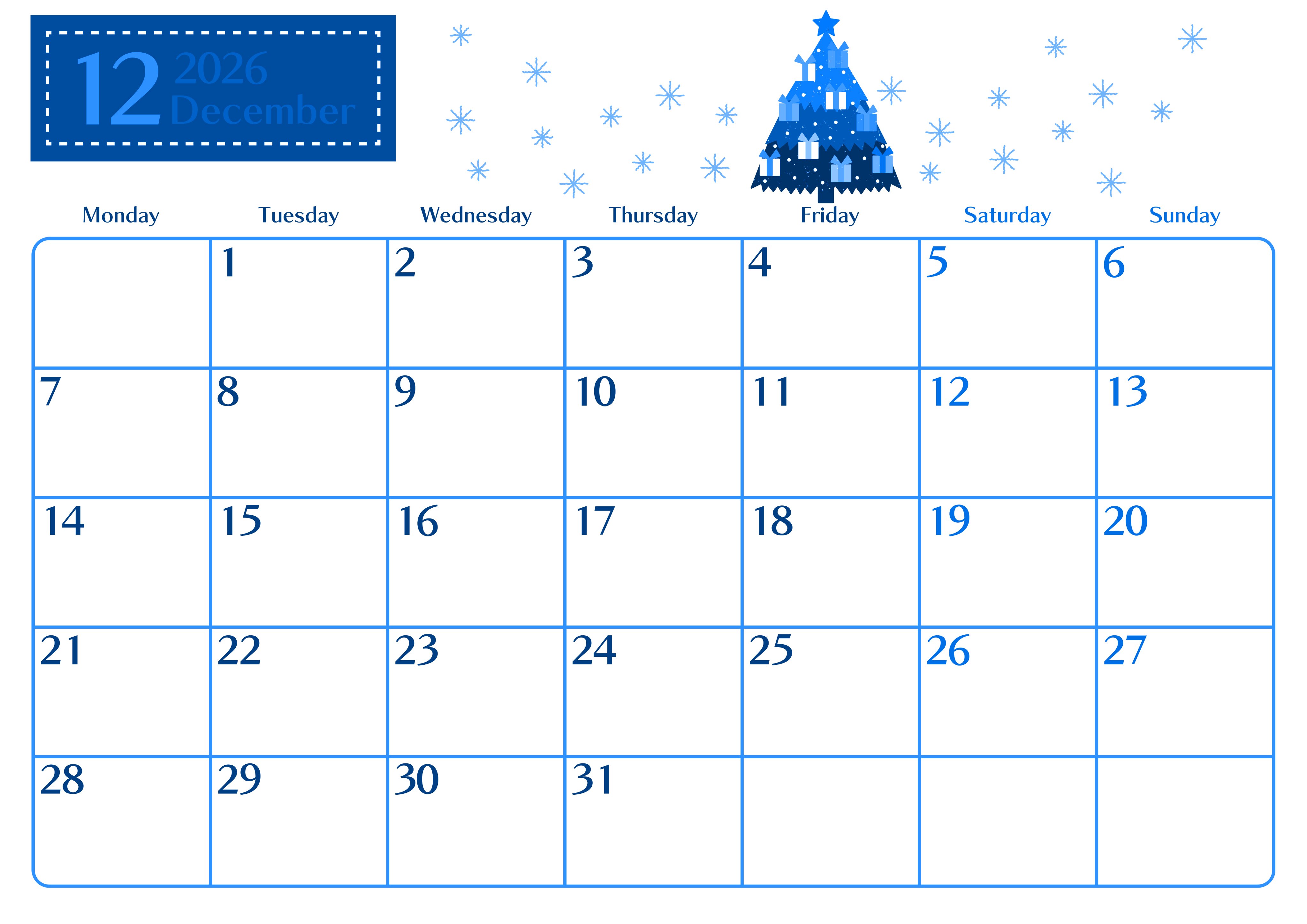 2026年・無料のカレンダーテンプレート 2026年12月横型月曜始まり クリスマスツリーイラストのおしゃれA4無料ブルーのカレンダー(2026-00901201) 素材状デザイン王 2025年4月4日 2026年12月横型月曜始まりの無料テンプレートブルーのカレンダーです。緑色のクリスマスツリーに白色のプレゼントボックスのコントラストが映える目に優しいおしゃれなイラストも魅力的です。(2026-00901201) 12月 横型のカレンダー 月曜始まり ブルー カレンダーデザイン-0090
