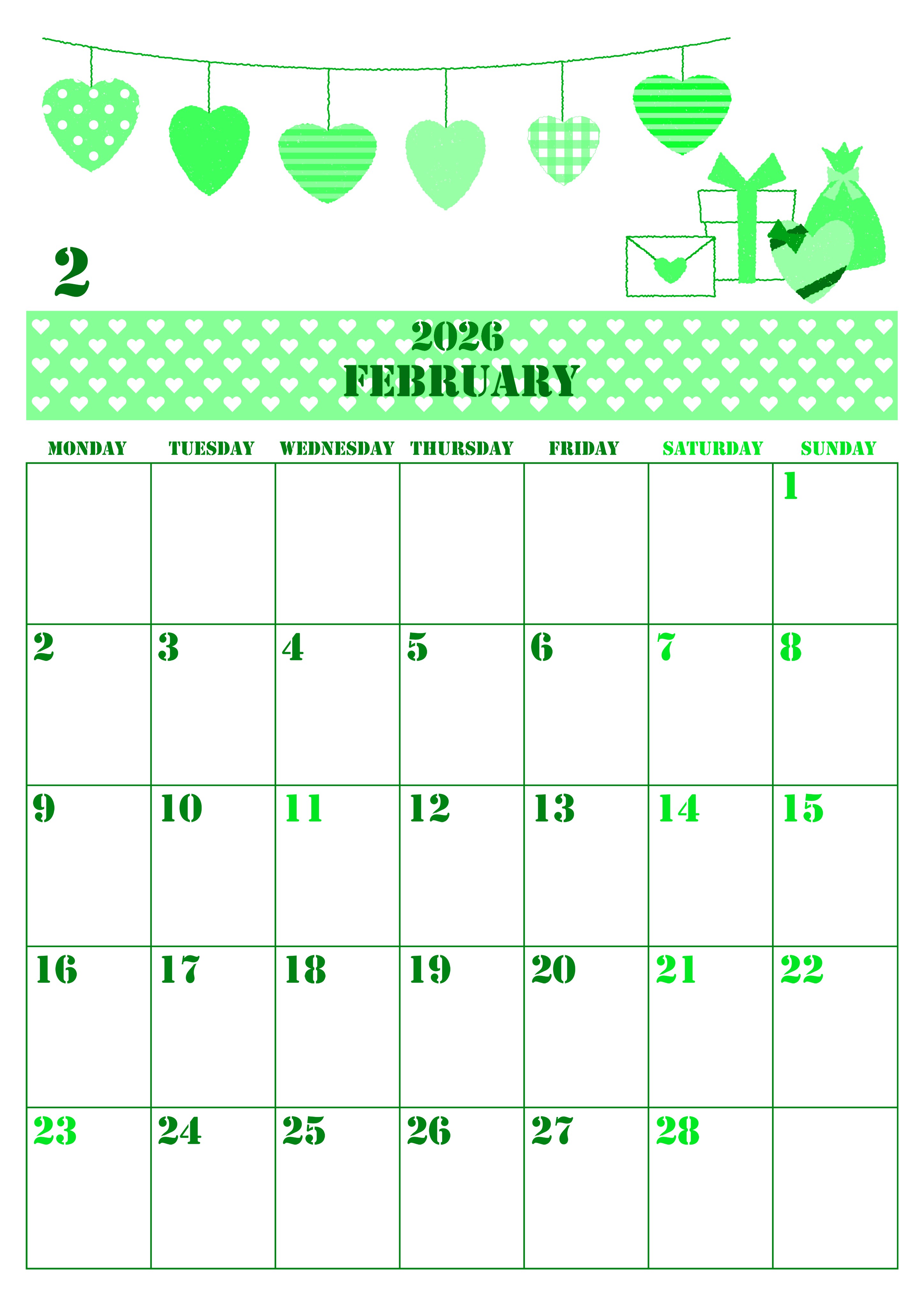 2026年2月縦型月曜始まりの無料テンプレートグリーンのカレンダーです。月曜始まりなので家族の予定を立てるのにとても適しているフリー素材です。曜日によって文字の色分けがされているので読み違いを防げる縦型グリーンのカレンダーでイラストもかわいいです。(2026-00910211)