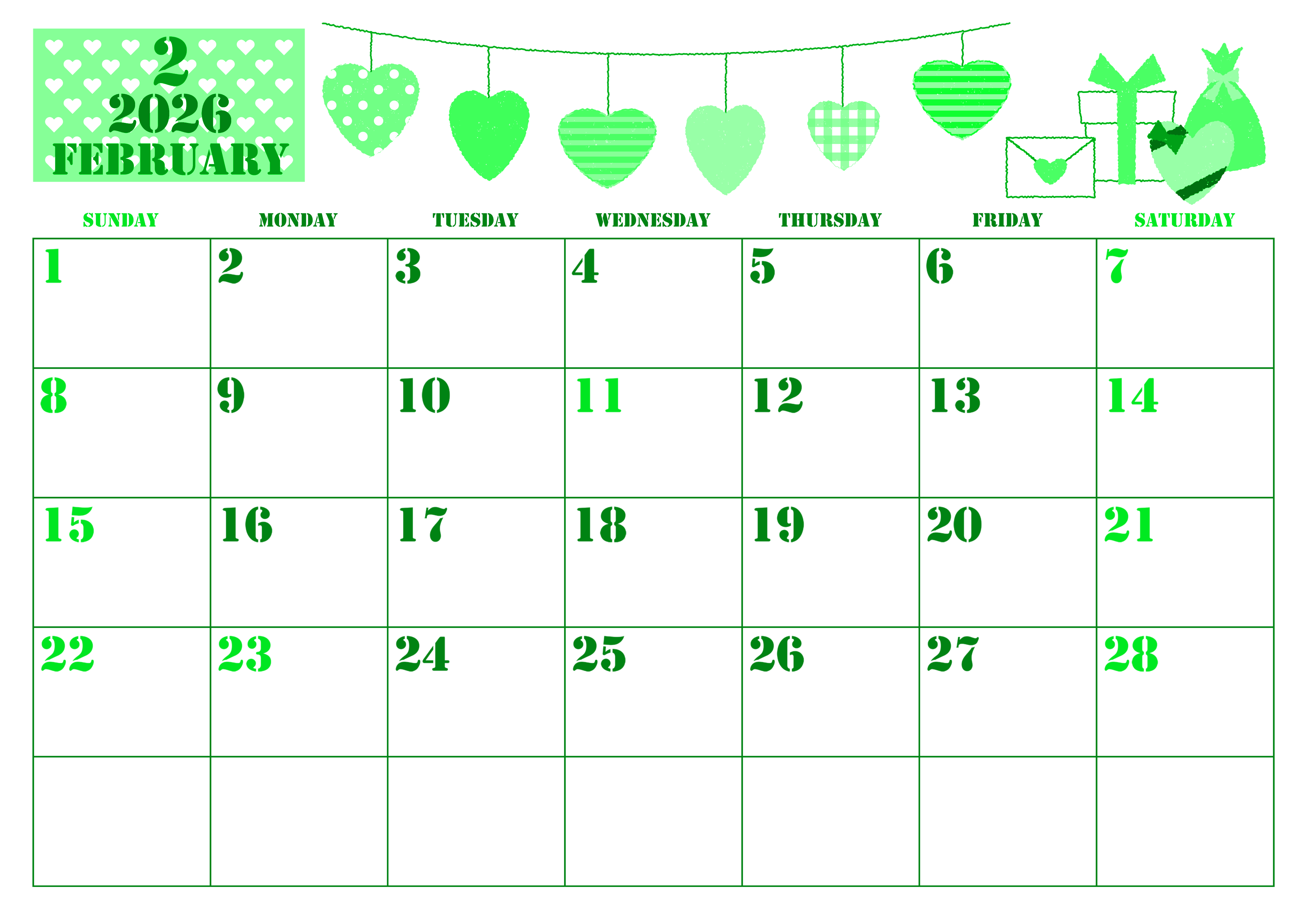 2026年2月横型日曜始まりの無料テンプレートグリーンのカレンダーです。ラブレターのイラストがガーリーでかわいい日曜始まりのフリー素材グリーンのカレンダーです。ハートのオーナメントがぶらさがっているデザインもかわいいです。(2026-00910200)
