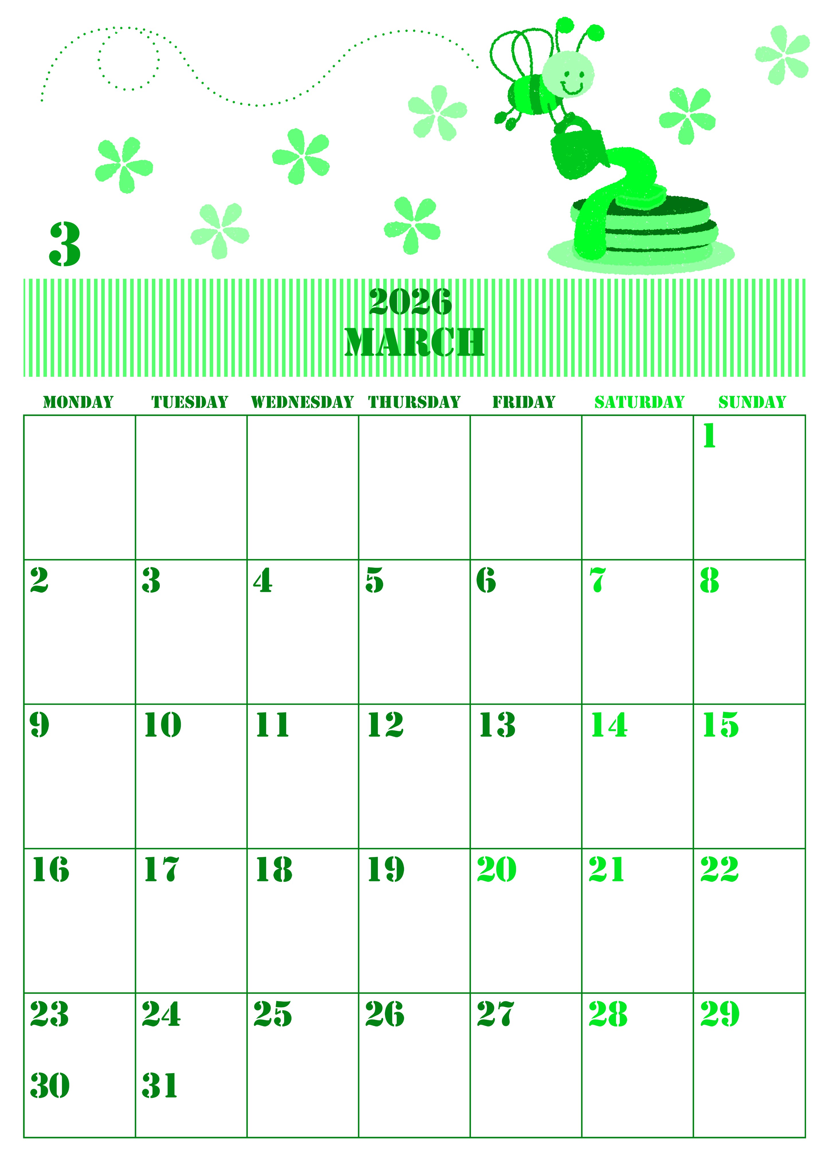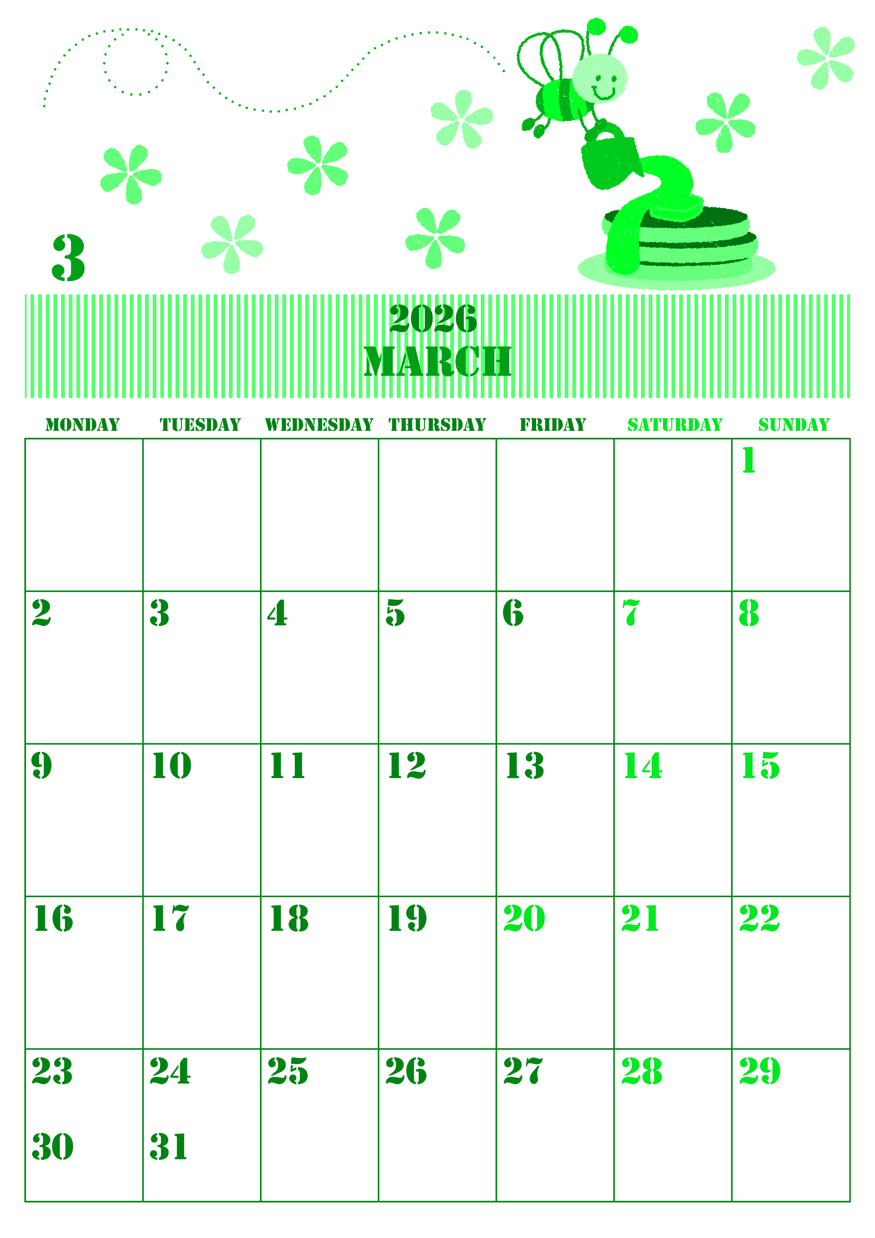 2026年3月縦型月曜始まりの無料テンプレートグリーンのカレンダーです。たっぷりのメープルシロップをミツバチが一生懸命かけているかわいいフリー素材のイラストです。月曜始まりグリーンのカレンダーなので予定管理に最適です。(2026-00910311)
