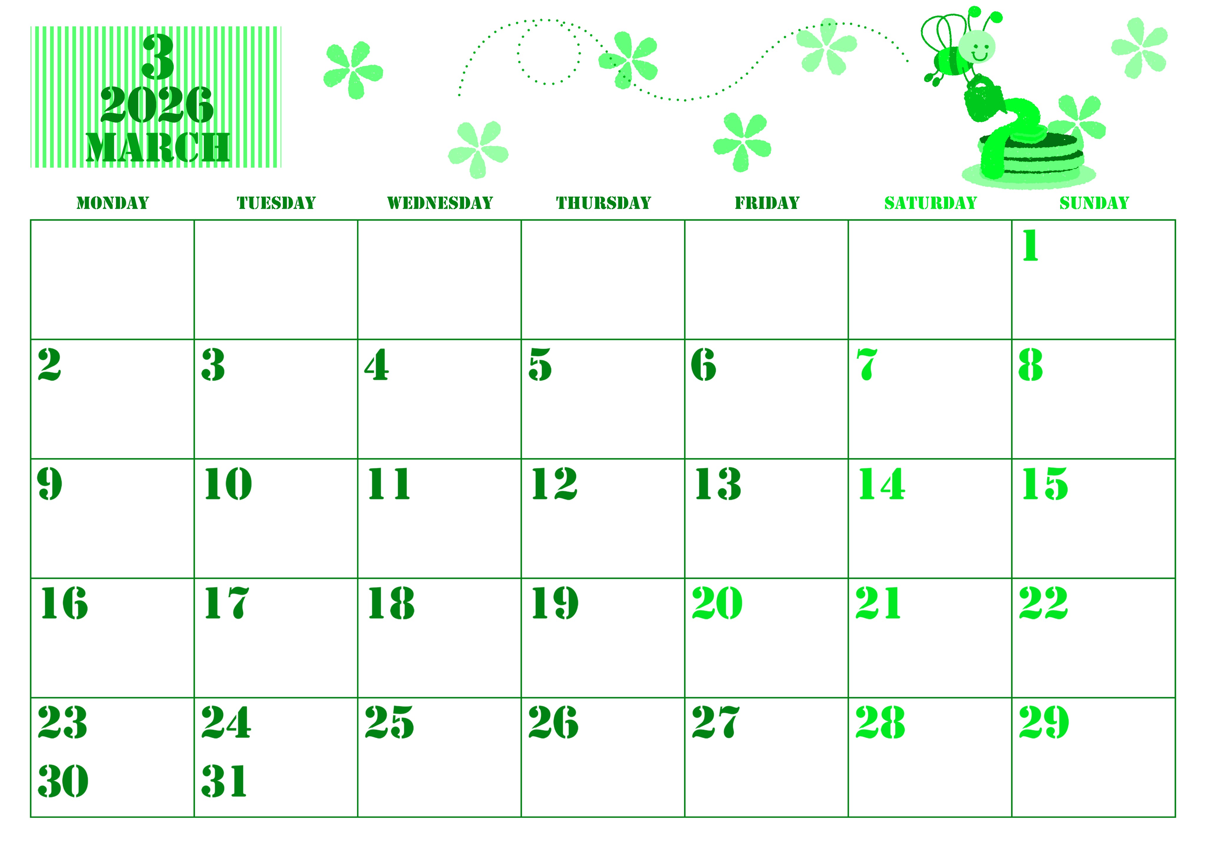 2026年・無料のカレンダーテンプレート 2026年3月横型月曜始まり パンケーキイラストのかわいいA4無料グリーンのカレンダー(2026-00910301) 素材状デザイン王 2025年4月5日 2026年3月横型月曜始まりの無料テンプレートグリーンのカレンダーです。花が散りばめられる中を笑顔のミツバチがパンケーキにトッピングしているかわいいイラストの月曜始まりグリーンのカレンダーです。(2026-00910301) 3月 横型のカレンダー 月曜始まり グリーン カレンダーデザイン-0091