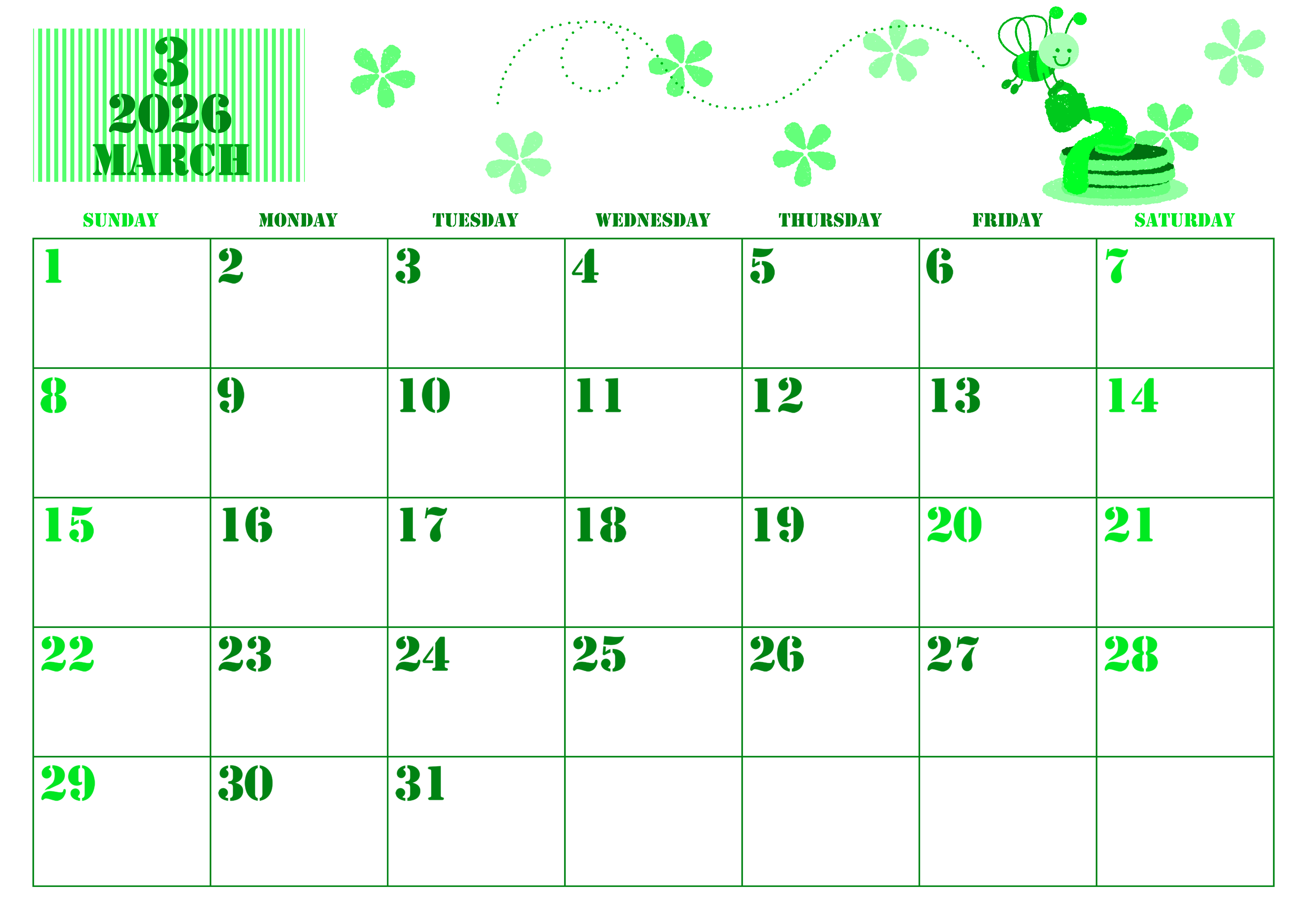 2026年3月横型日曜始まりの無料テンプレートグリーンのカレンダーです。ミツバチがふわふわとパンケーキの上を飛んでメイプルシロップをかけている様子がかわいいスイーツモチーフのイラストが特徴的なグリーンのカレンダーです。(2026-00910300)
