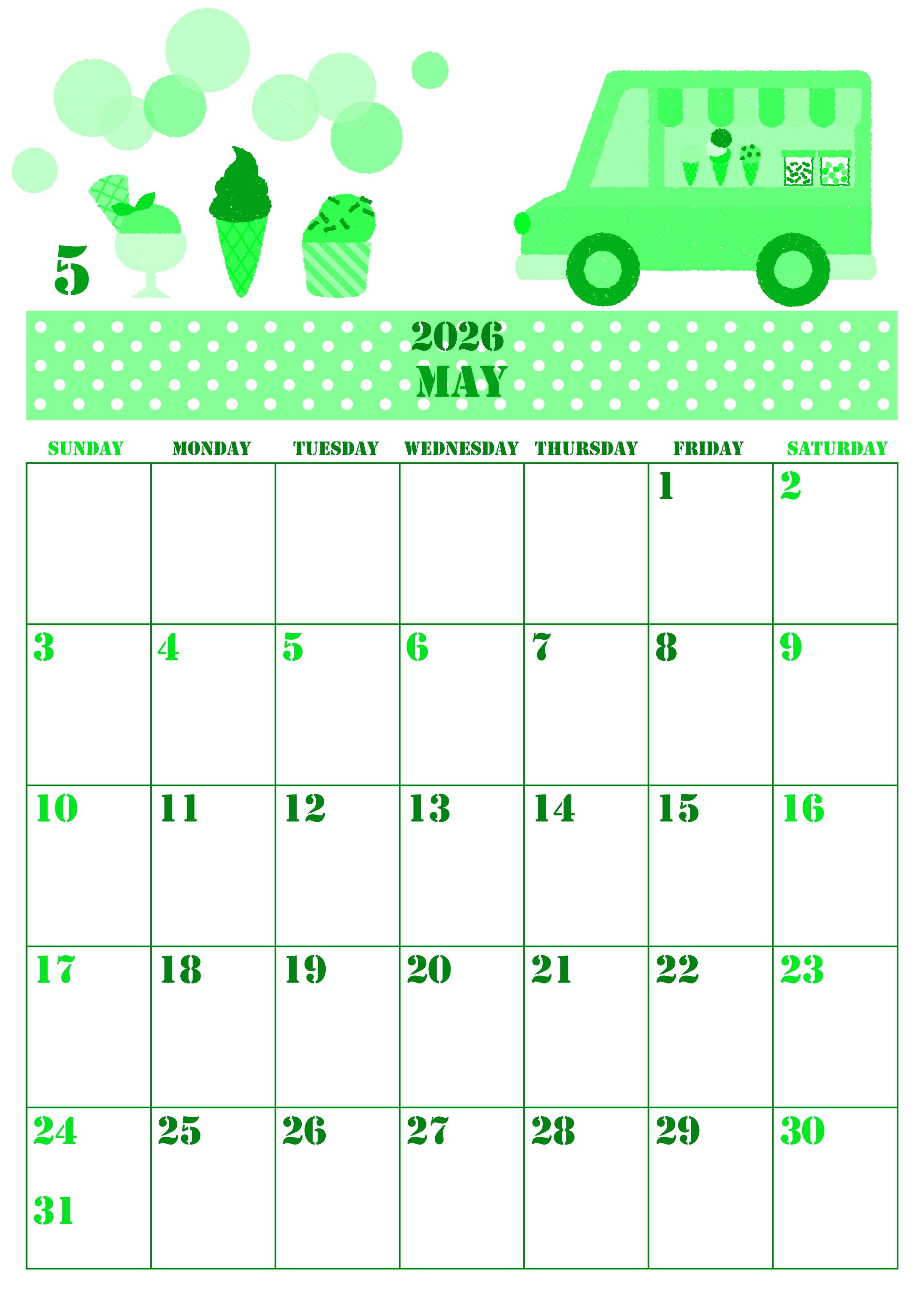 2026年5月縦型日曜始まりの無料テンプレートグリーンのカレンダーです。アイスクリームを運ぶトラックのイラストが楽しいイベントを連想させるような使いたくなるかわいい無料のグリーンのカレンダーとなっています。(2026-00910510)