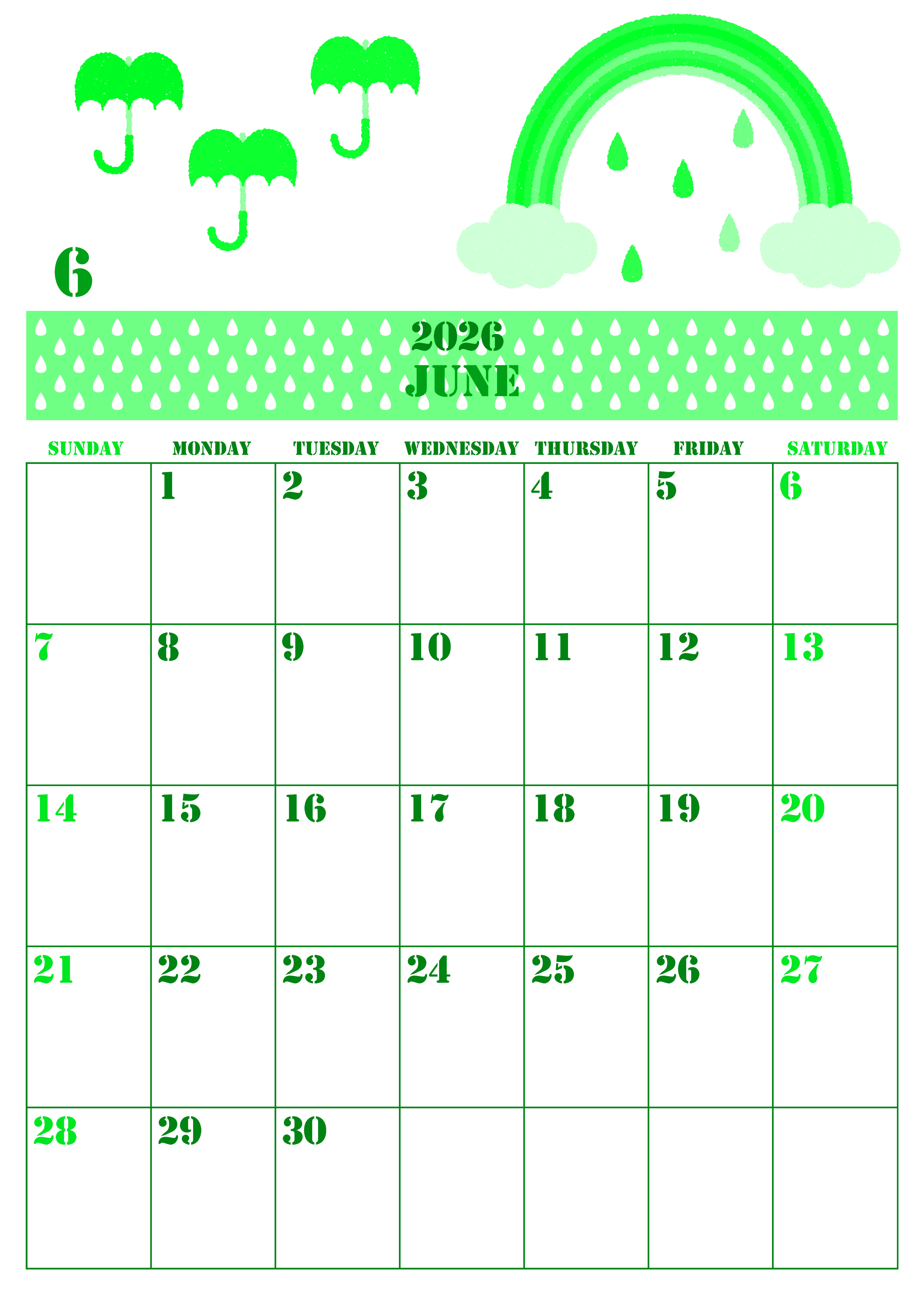 2026年6月縦型日曜始まりの無料テンプレートグリーンのカレンダーです。傘や虹のイラストがほのぼのとした気持ちにさせてくれるかわいいイラストです。白紙に印刷をしてすぐに使えるグリーンのカレンダーなので便利です。(2026-00910610)
