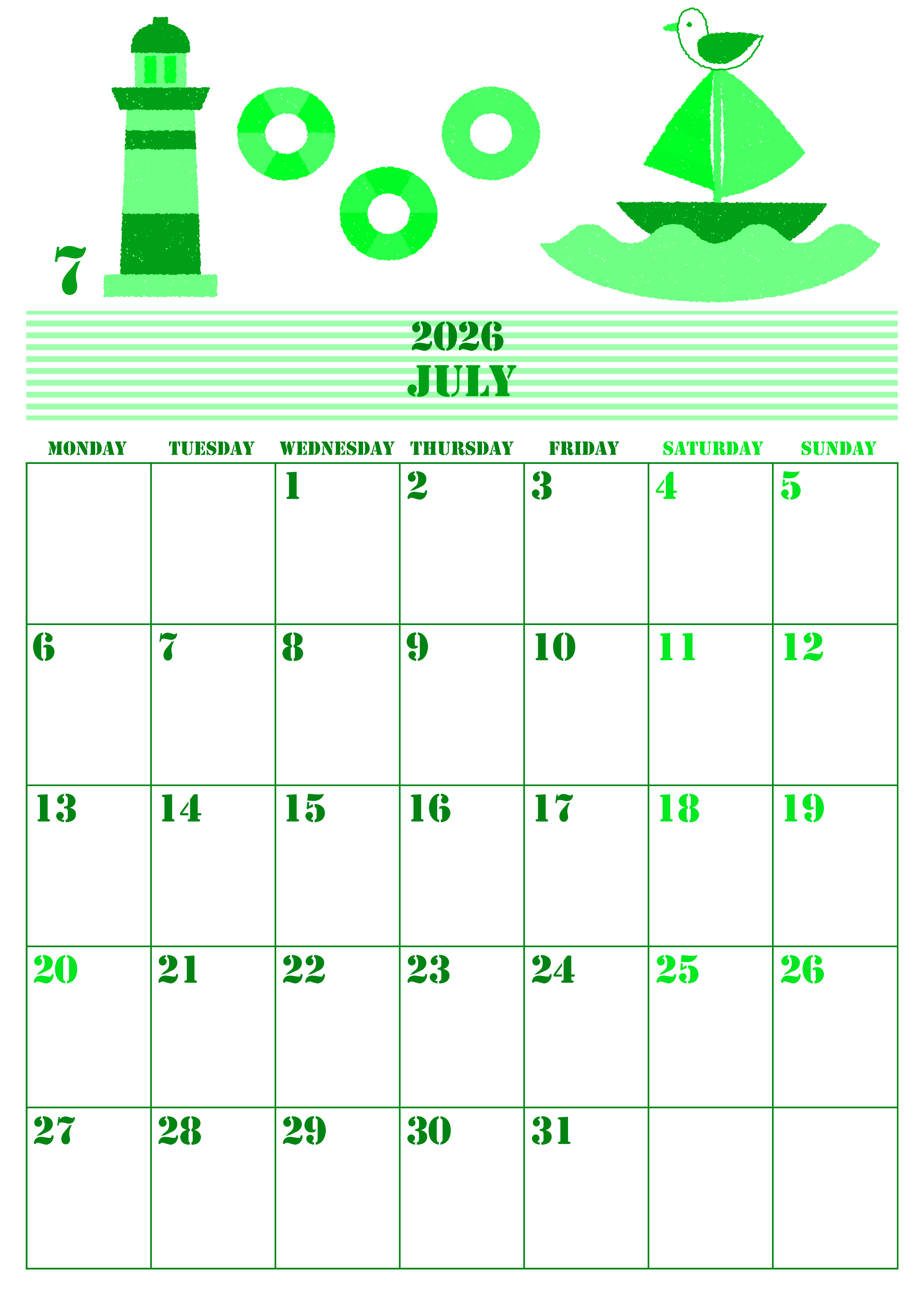 2026年7月縦型月曜始まりの無料テンプレートグリーンのカレンダーです。月曜始まりグリーンのカレンダーが欲しいという人に向いている無料素材です。イラストはマリンな澄んだテイストでかわいいポップ調となっています。(2026-00910711)