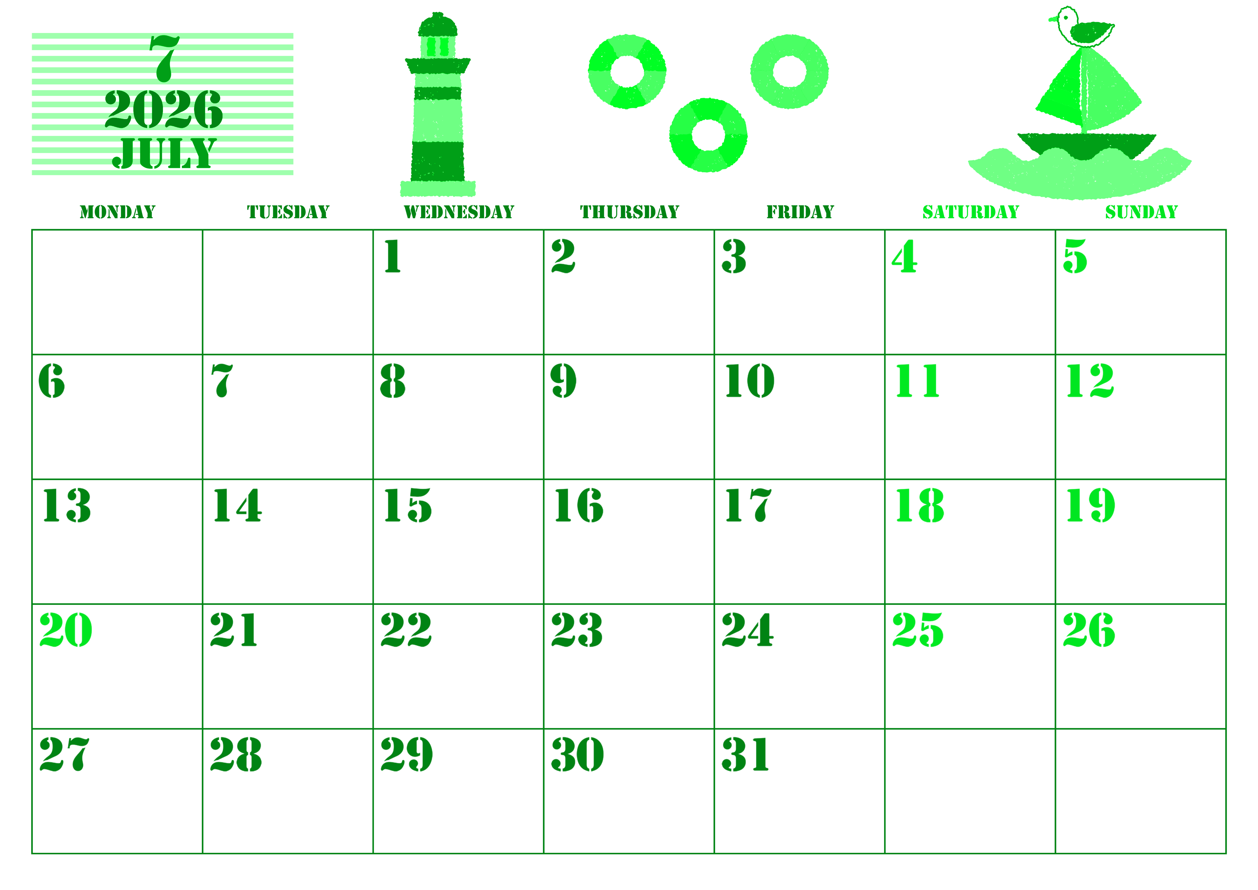 2026年7月横型月曜始まりの無料テンプレートグリーンのカレンダーです。月曜始まりで計画を立てるのに適しているレイアウトのグリーンのカレンダーです。白い背景に灯台や浮き輪というアイテムを描いたかわいいイラストも魅力的です。(2026-00910701)