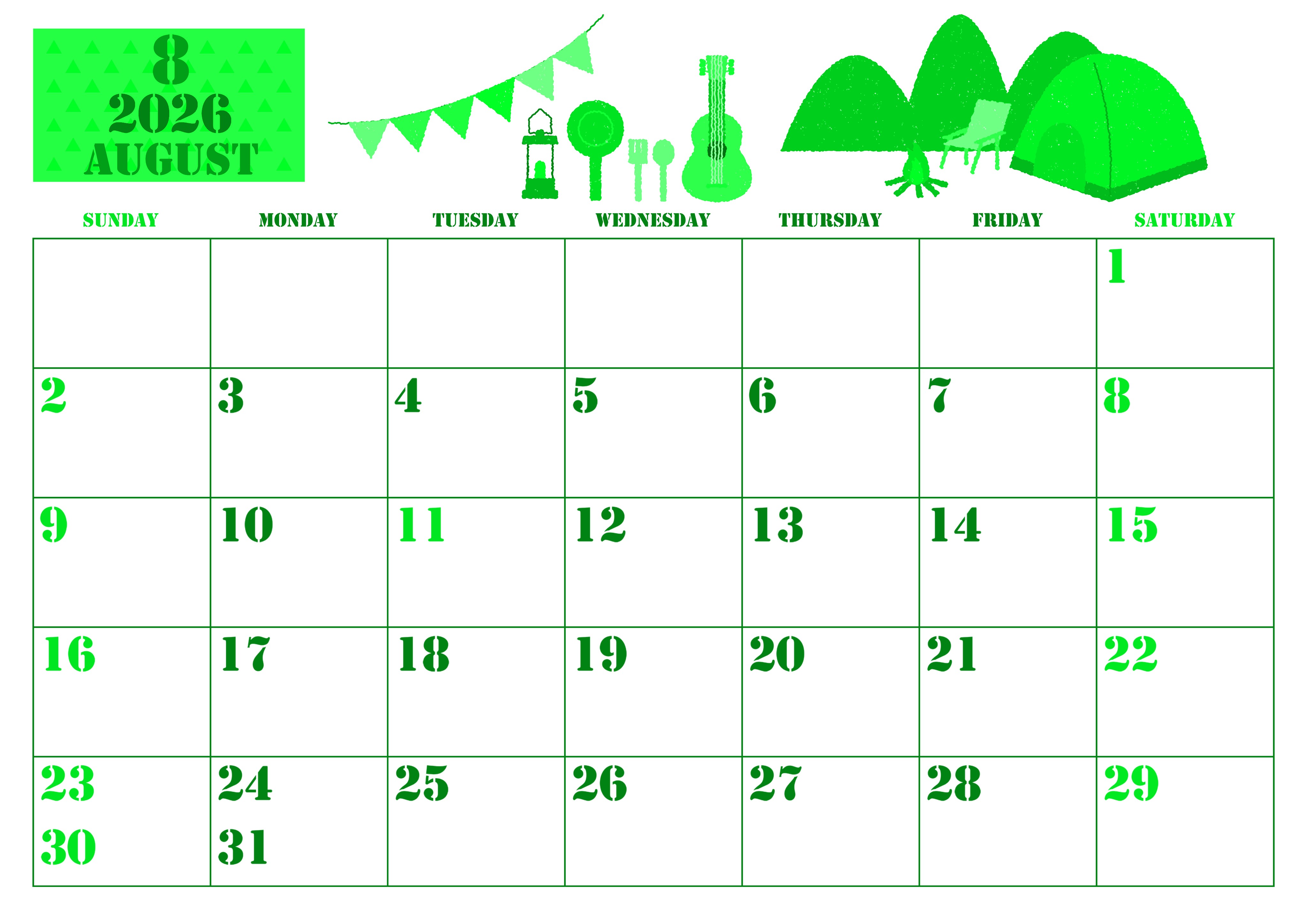 2026年8月横型日曜始まりの無料テンプレートグリーンのカレンダーです。夏休みにキャンプを楽しんでいる様子を描いているポップでかわいいイラストがグリーンのカレンダーを使って計画を立てる意欲を掻き立ててくれます。(2026-00910800)