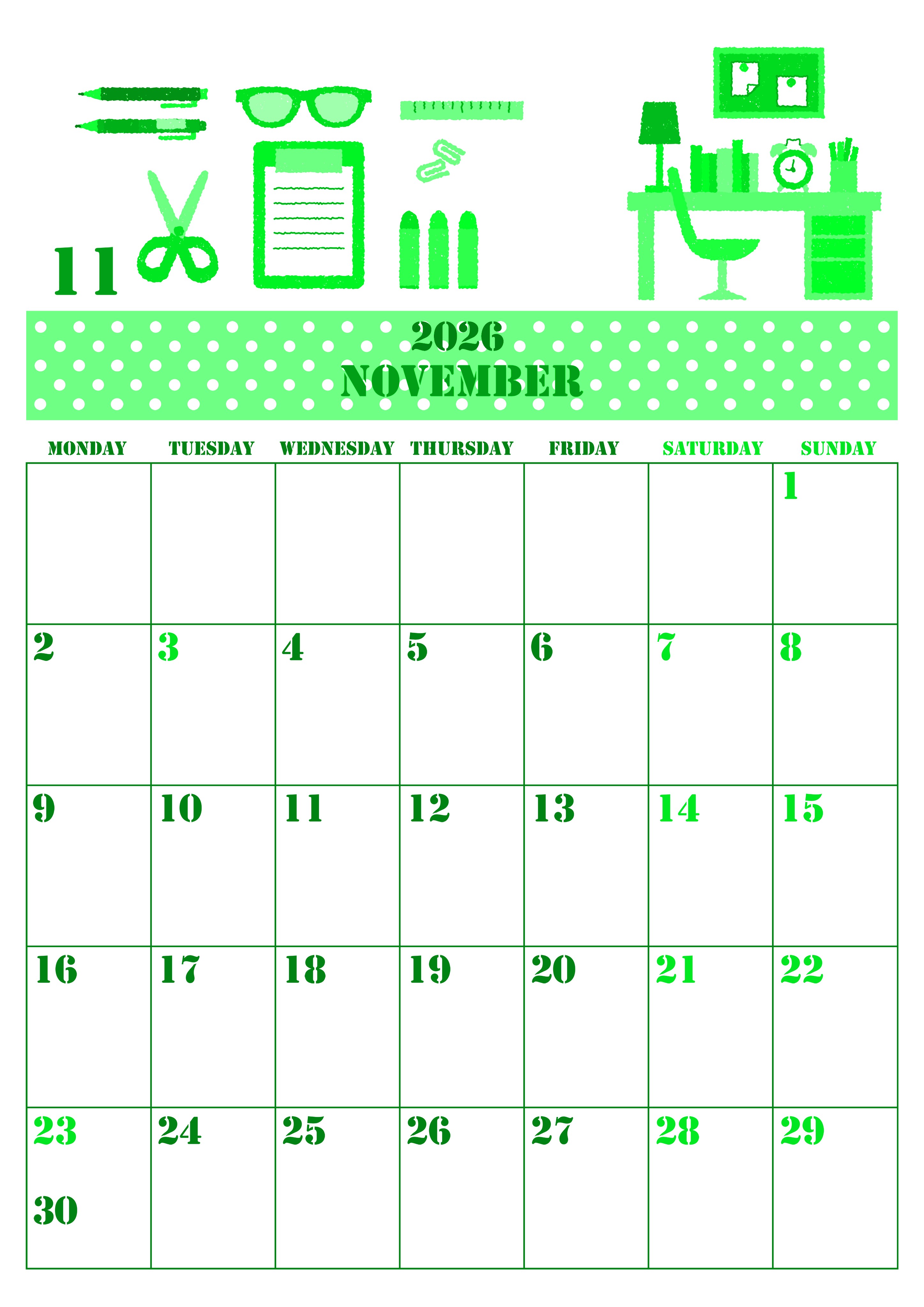 2026年11月縦型月曜始まり 文房具イラストのかわいいA4無料グリーンのカレンダー(2026-00911111)