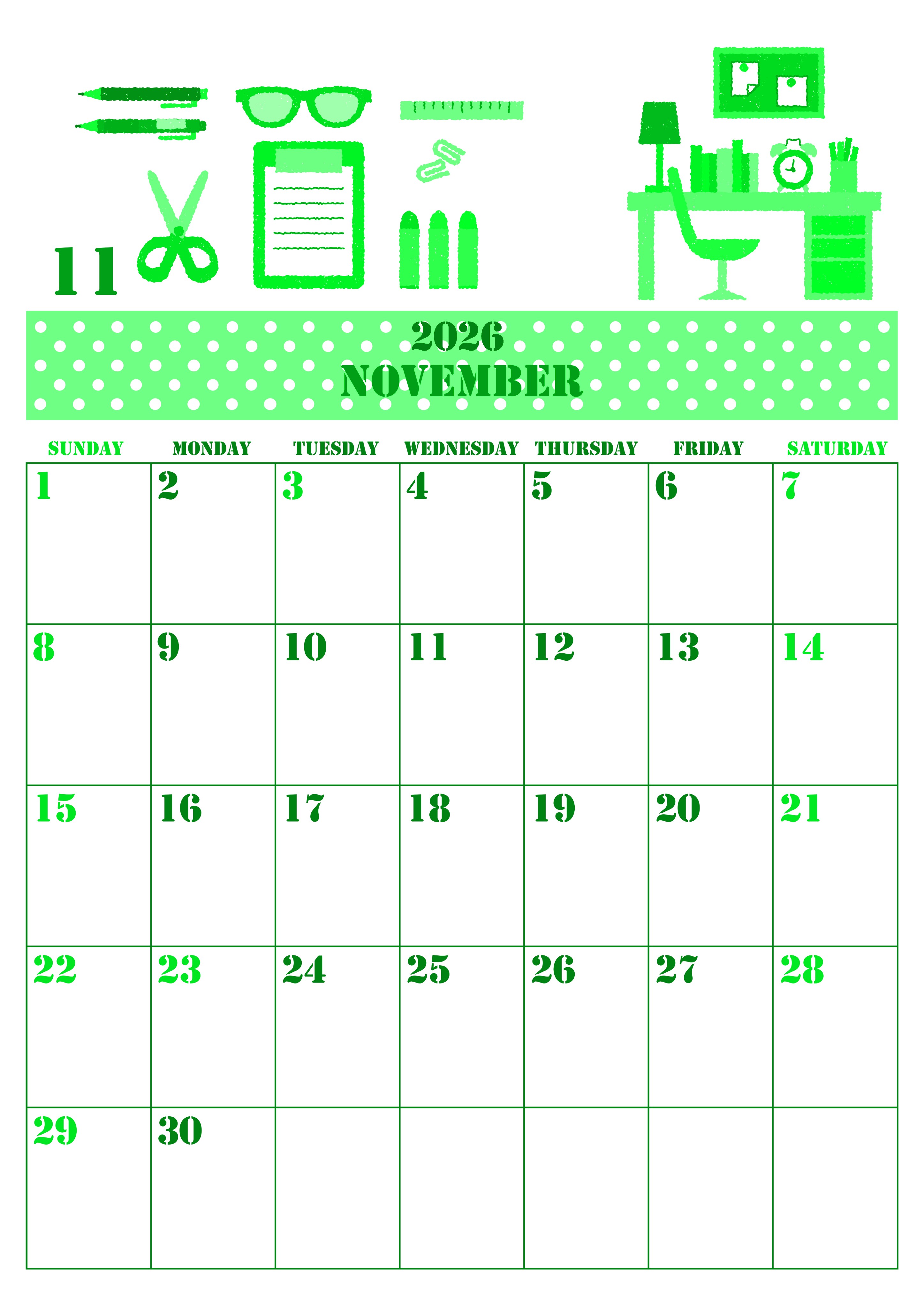 2026年・無料のカレンダーテンプレート 2026年11月縦型日曜始まり 文房具イラストのかわいいA4無料グリーンのカレンダー(2026-00911110) 素材状デザイン王 2025年4月5日 2026年11月縦型日曜始まりの無料テンプレートグリーンのカレンダーです。あらゆる文房具のイラストが丁寧に描かれていてかわいいデザインの縦向きグリーンのカレンダーは壁に貼って使うをおすすめします。(2026-00911110) 11月 縦型のカレンダー 日曜始まり グリーン カレンダーデザイン-0091