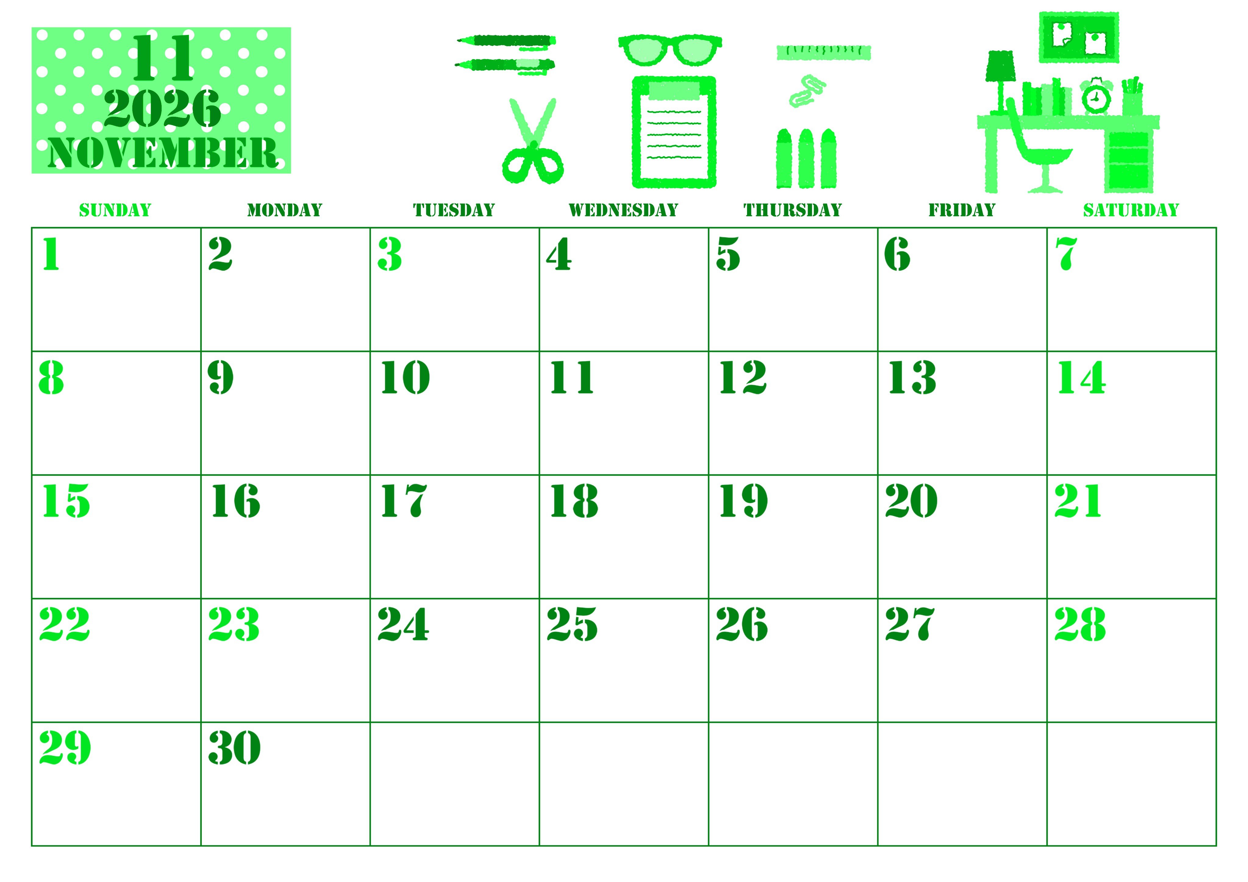 2026年11月横型日曜始まりの無料テンプレートグリーンのカレンダーです。年月の背景部分に白いドットがほどこされていてポップなテイストです。イラストはバラエティに富んだ文房具を取り上げていてはっきりとしていてかわいいです。(2026-00911100)