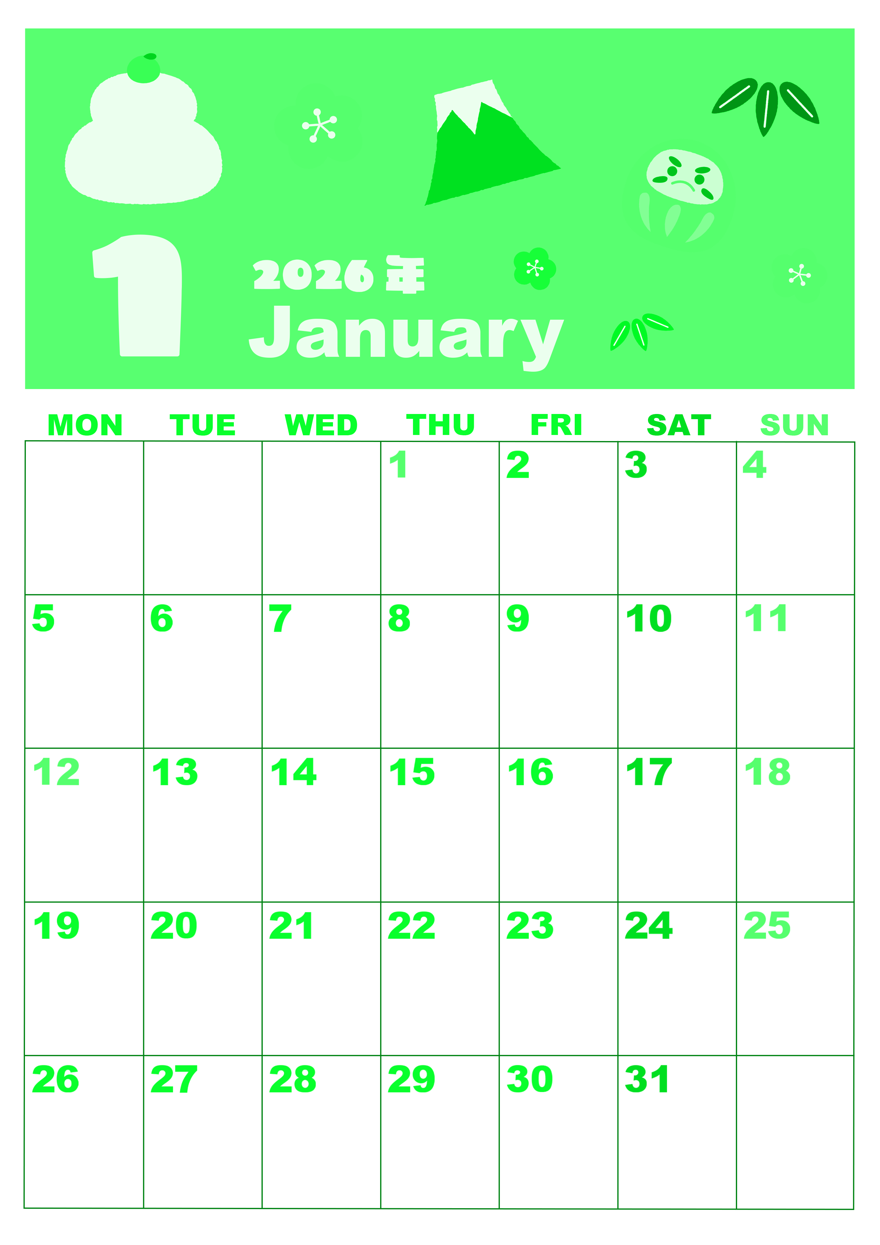 2026年1月縦型月曜始まりです。イラストは和風とかわいいが共存しています。スケジュールを書き込みする部分は白色なので使いやすいグリーンのカレンダーです。曜日も色分けされていて日付の文字は少し薄い色合いとどこまでもかわいい素材なのでダウンロードをおすすめします。(2026-00920111)