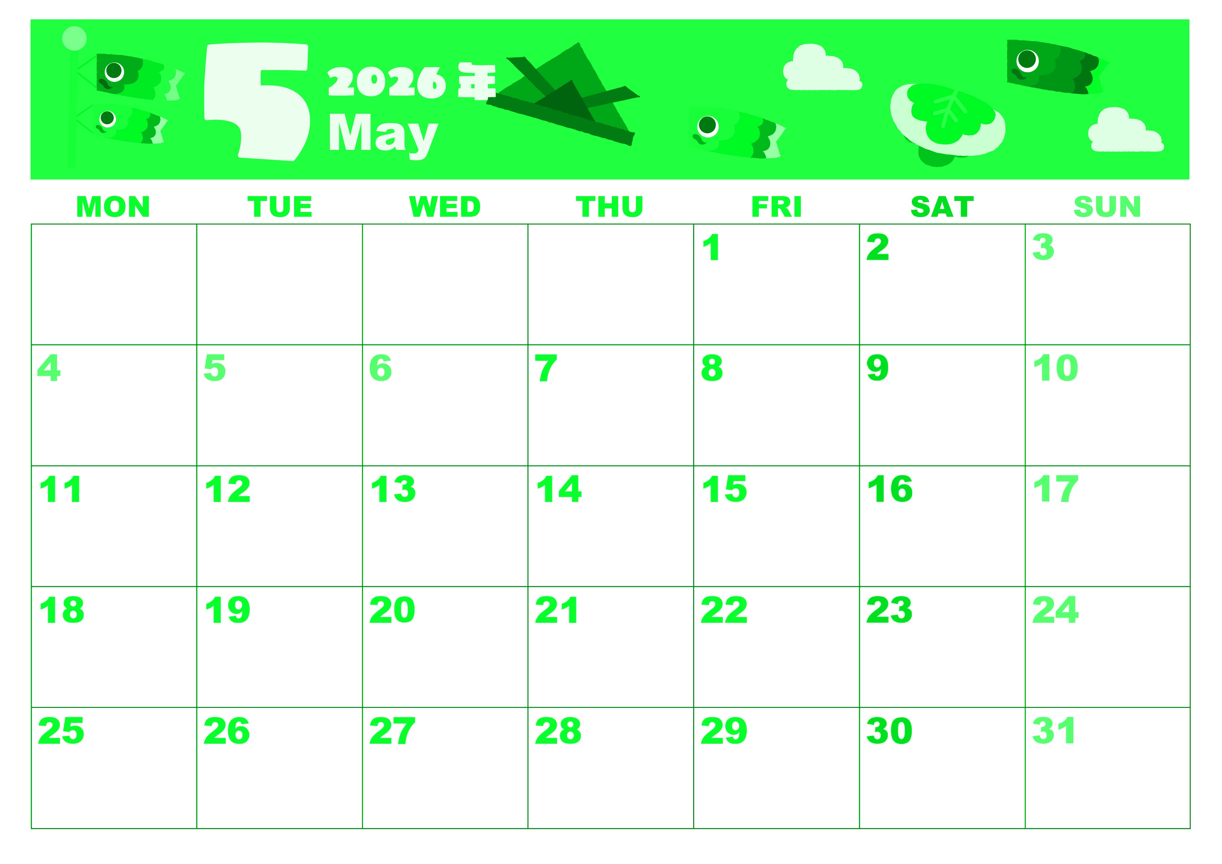 2026年5月横型月曜始まりの無料テンプレートグリーンのカレンダーです。くりくりとした目の鯉のぼりが飛翔していたりと5月の行事の世界観が満載のかわいいグリーンのカレンダー素材は無料でダウンロード可能です。(2026-00920501)