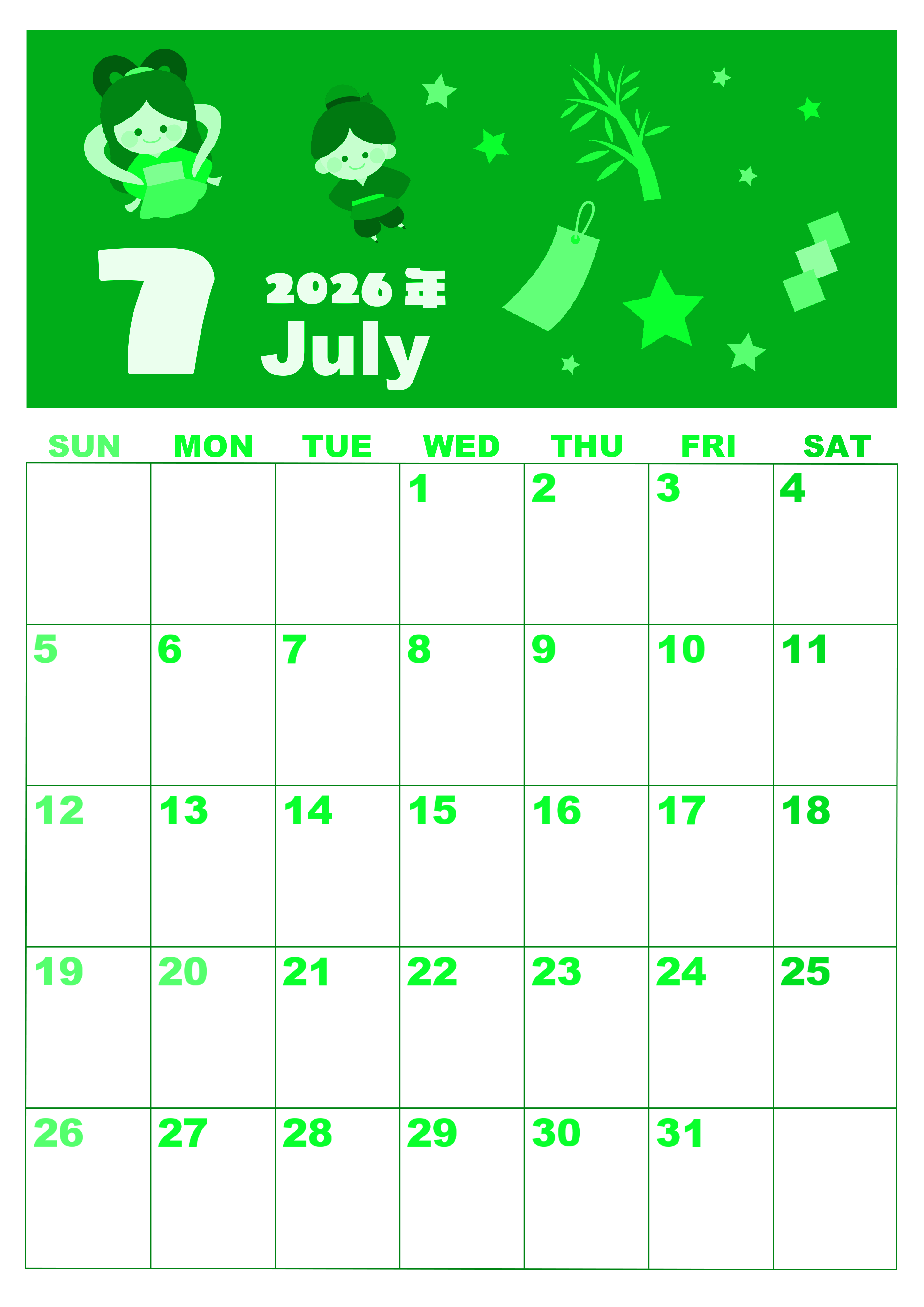 2026年7月縦型日曜始まりの無料テンプレートグリーンのカレンダーです。織姫と彦星だけでなく七夕で使われる短冊といろいろなアイテムが描かれている遊び心に溢れたかわいいイラストが目を引く使うのが楽しくなるグリーンのカレンダーです。(2026-00920710)