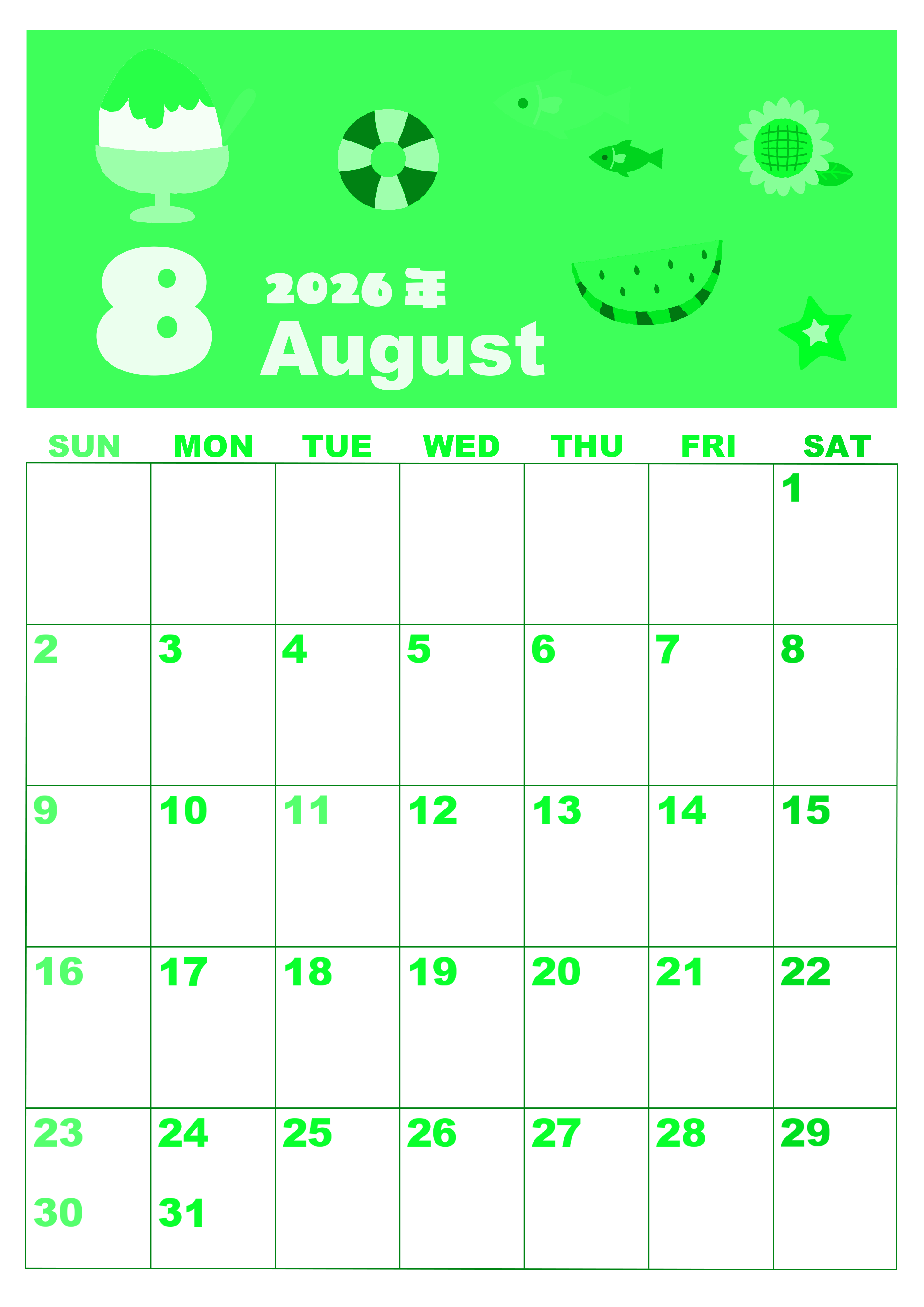 2026年8月縦型日曜始まりの無料テンプレートグリーンのカレンダーです。イラストには夏休みの楽しみを増幅させてくれるようなアイテムを起用していてどれもかわいいです。グリーンのカレンダー部分は余白が広いので記入しやすいです。(2026-00920810)