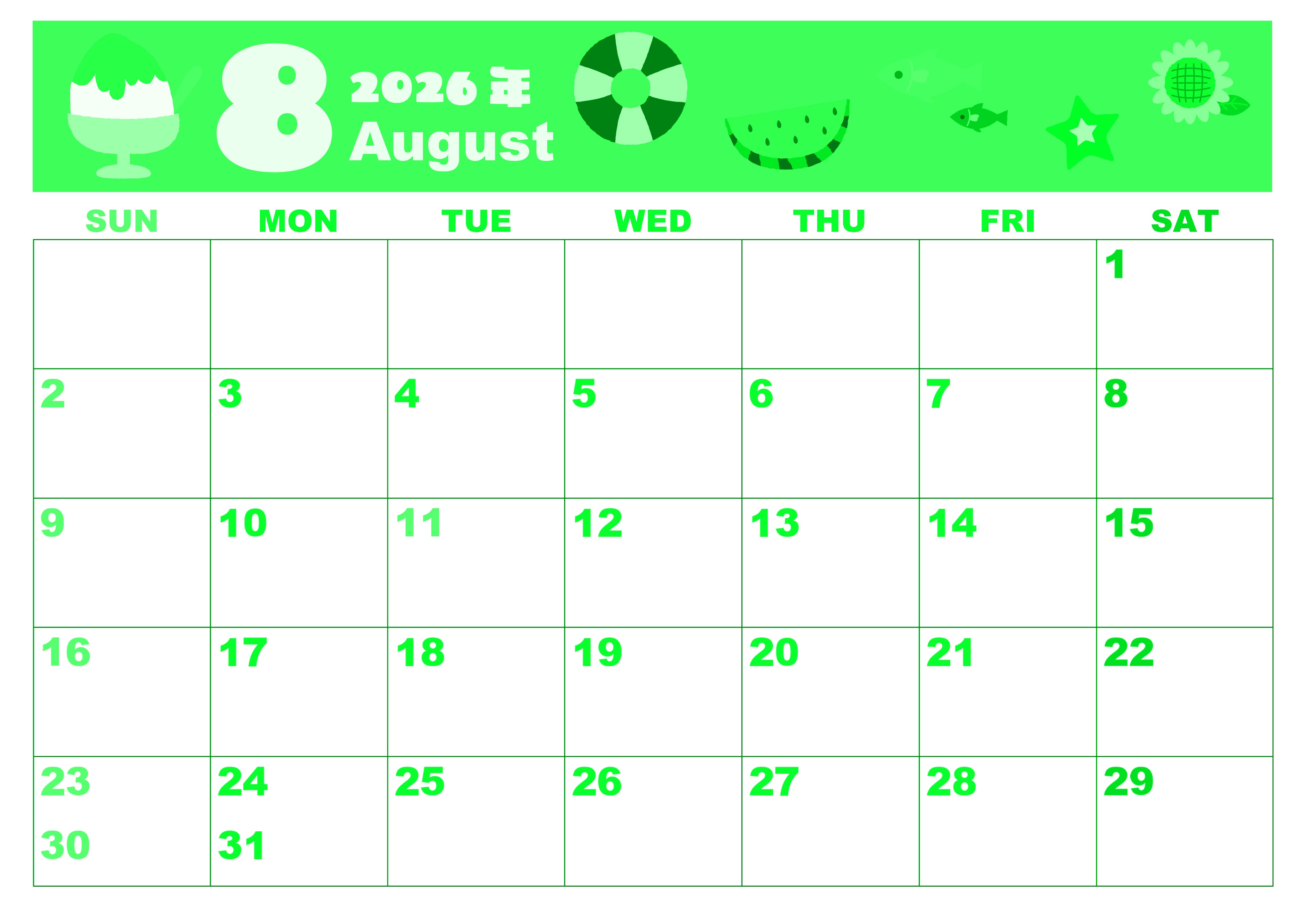 2026年8月横型日曜始まりの無料テンプレートグリーンのカレンダーです。ぽってりとした8月の文字が存在感があってかわいい夏休みをテーマにしたポップイラストグリーンのカレンダーです。A4サイズで無料にてお使い頂けます。(2026-00920800)