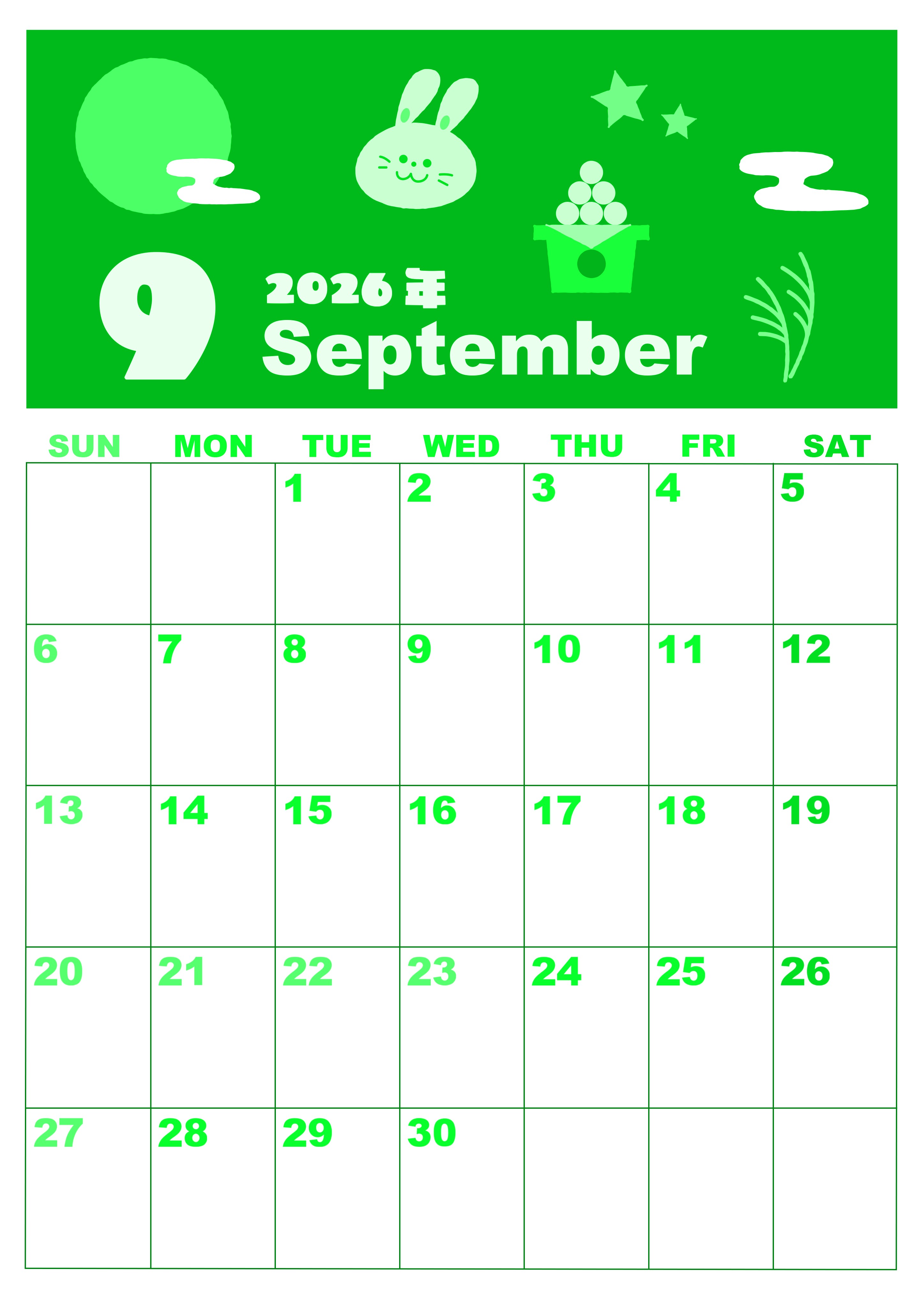 2026年・無料のカレンダーテンプレート 2026年9月縦型日曜始まり お月見イラストのかわいいA4無料グリーンのカレンダー(2026-00920910) 素材状デザイン王 2025年4月5日 2026年9月縦型日曜始まりの無料テンプレートグリーンのカレンダーです。お月見をするのにぴったりな夜の様子を描いたとてもかわいいイラストに仕上げました。縦向きに印刷するだけですぐに使えます。(2026-00920910) 9月 縦型のカレンダー 日曜始まり グリーン カレンダーデザイン-0092