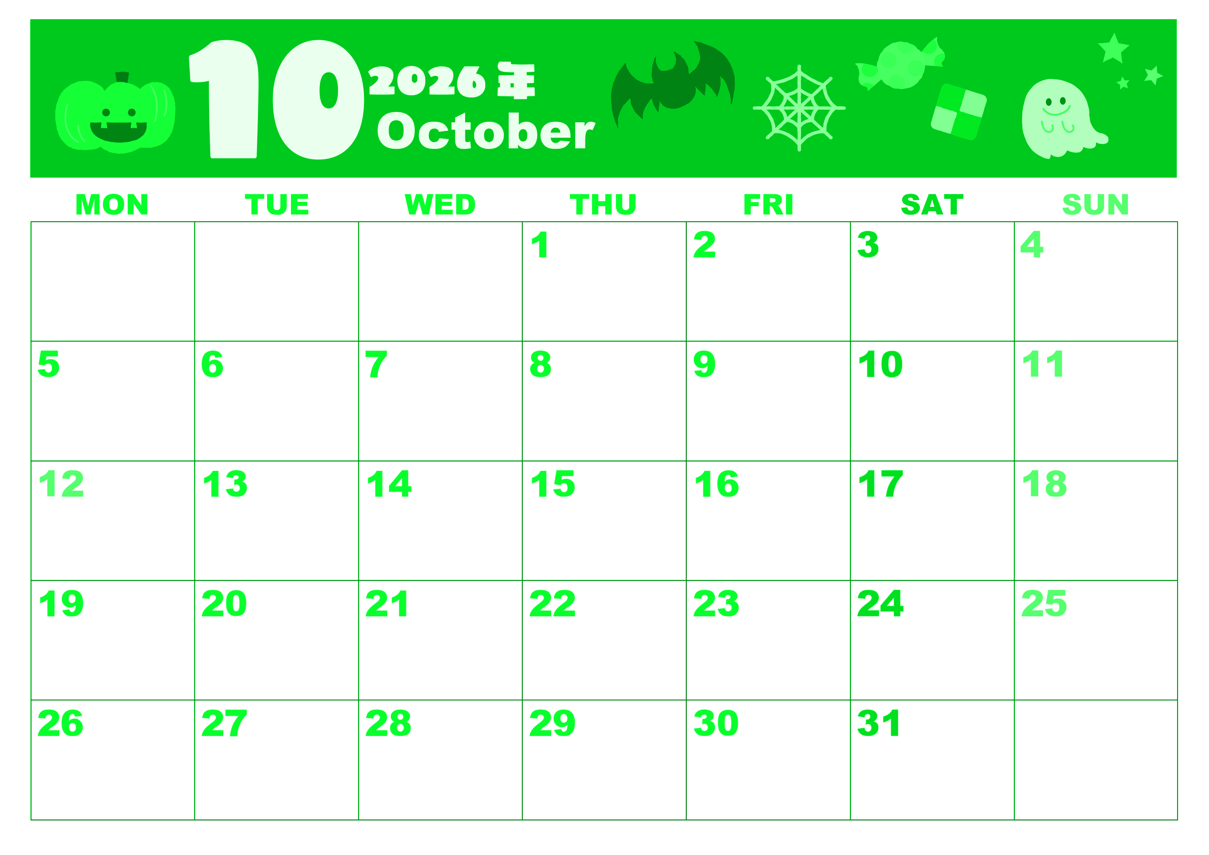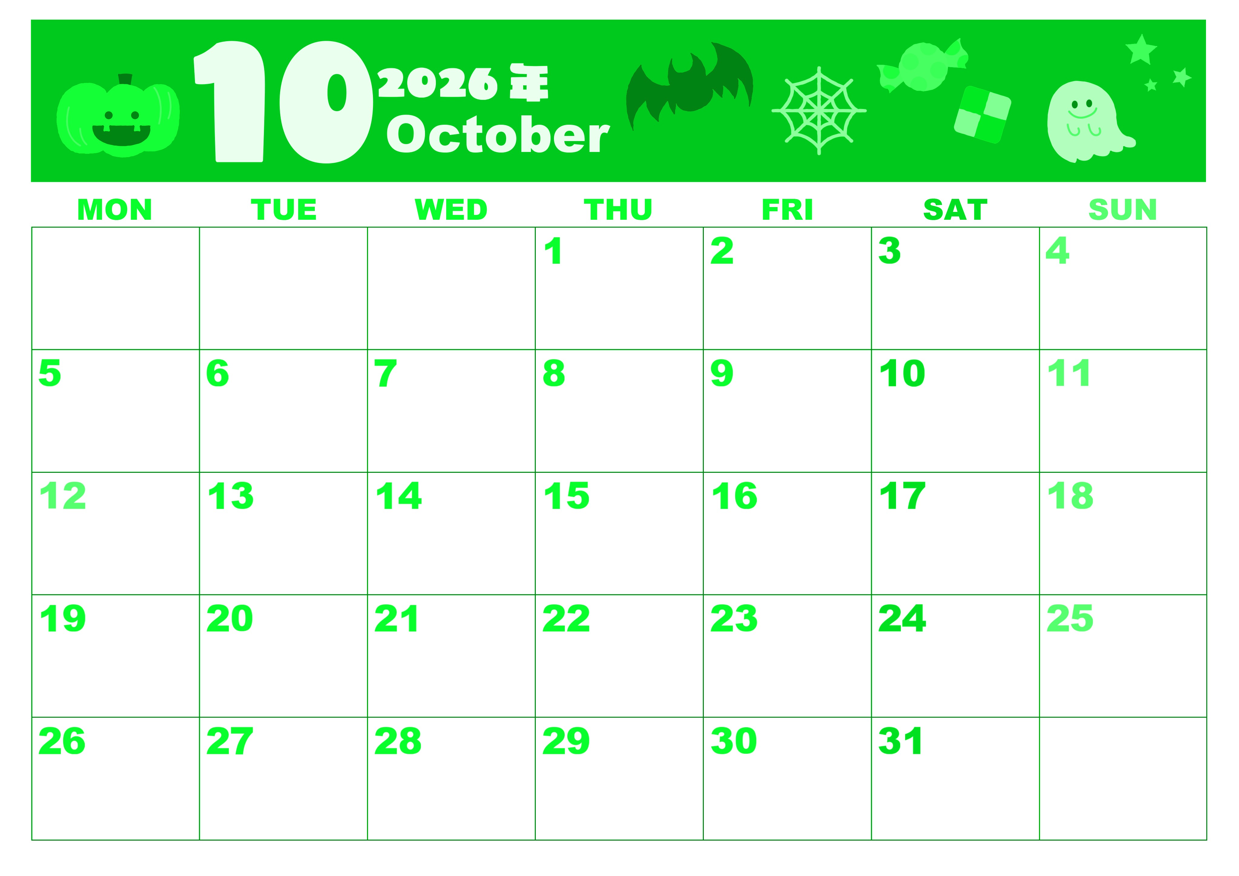 2026年10月横型月曜始まりの無料テンプレートグリーンのカレンダーです。クッキーやキャンディーといったお菓子だけでなくお化けやカボチャのイラストもとてもかわいい月曜始まりグリーンのカレンダーです。(2026-00921001)