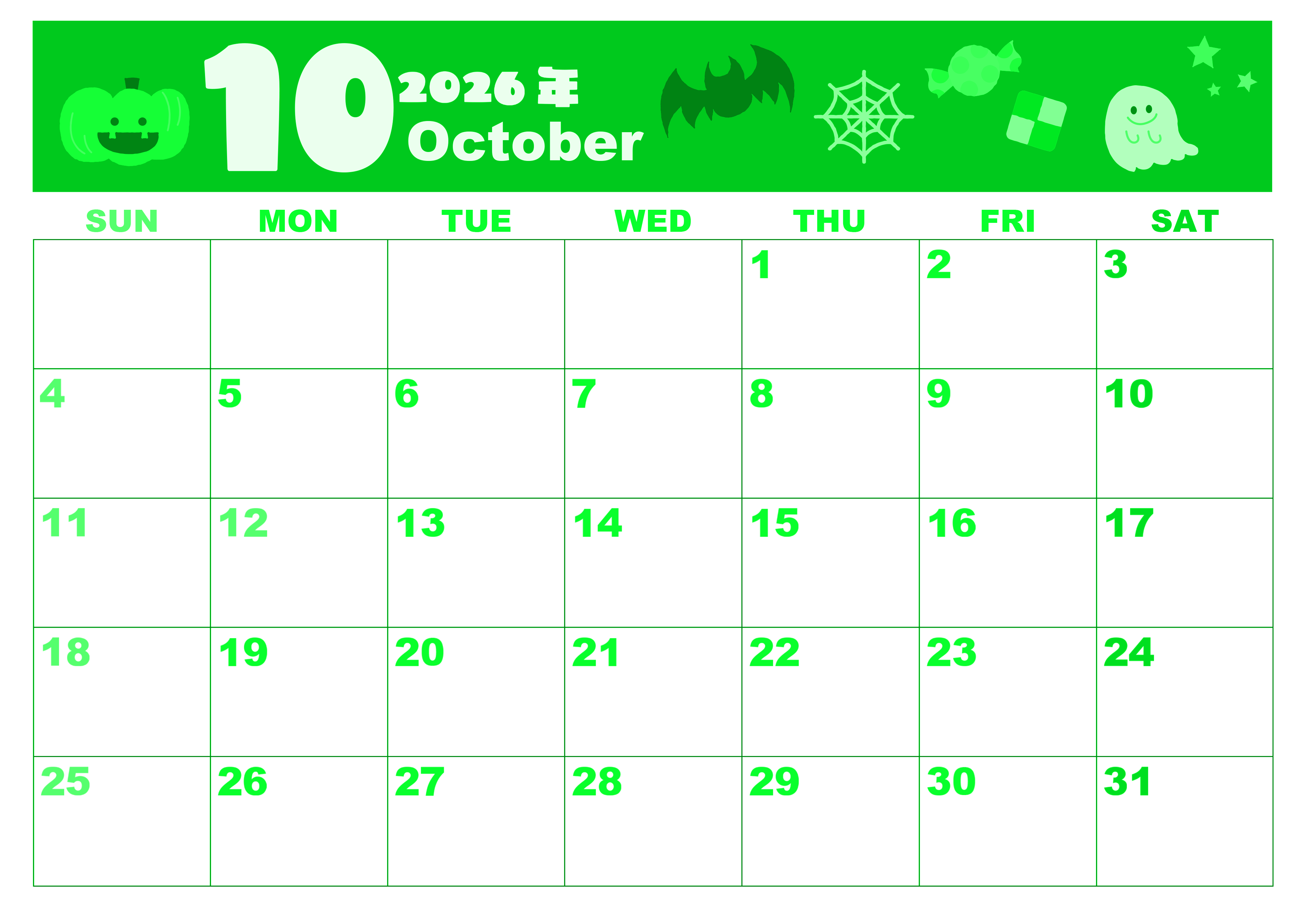 2026年10月横型日曜始まりの無料テンプレートグリーンのカレンダーです。ハロウィンといえばトリックオアトリート!とお菓子を子供たちにせがまれます。そんなお菓子を描いたかわいいイラストとなっています。(2026-00921000)