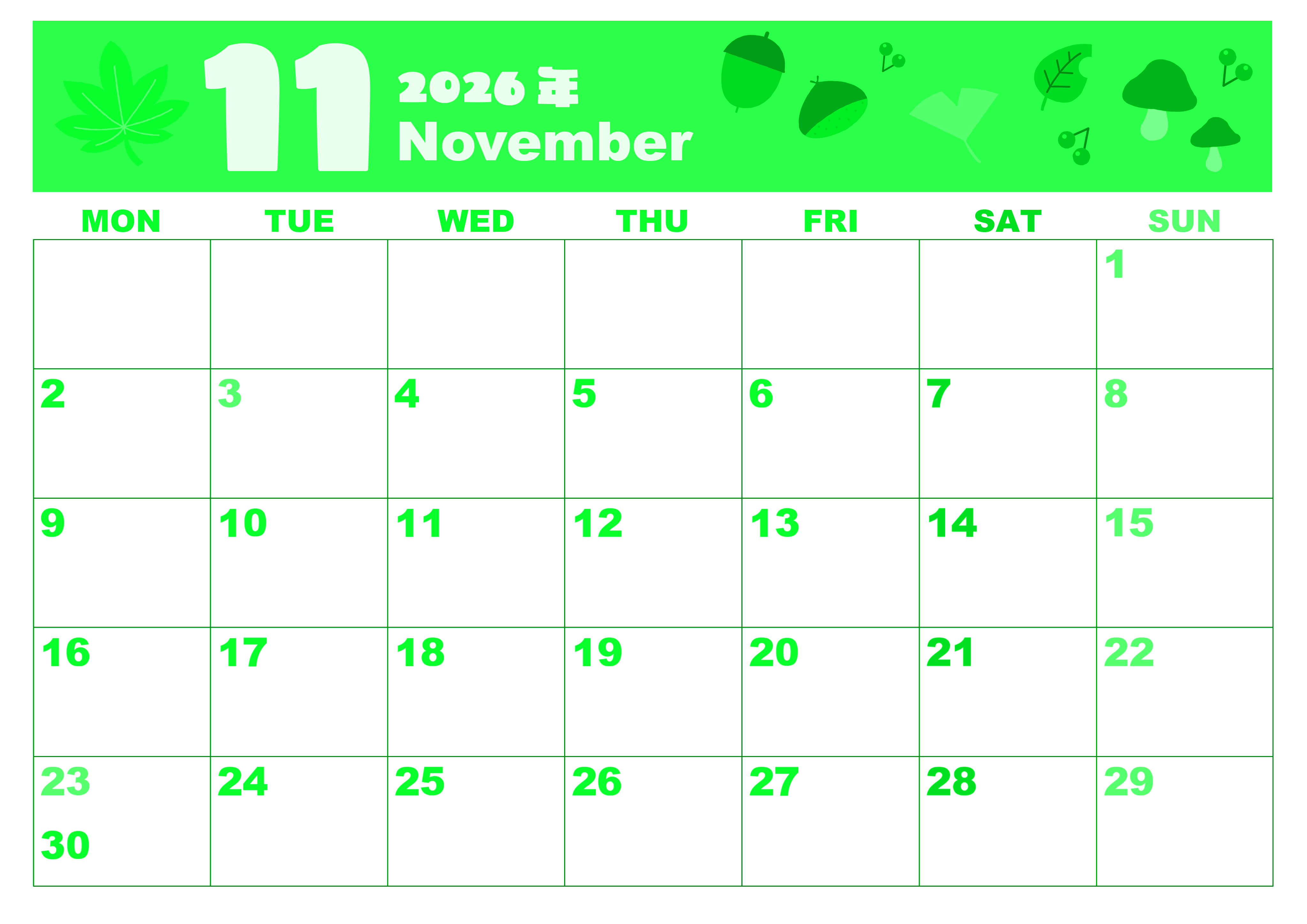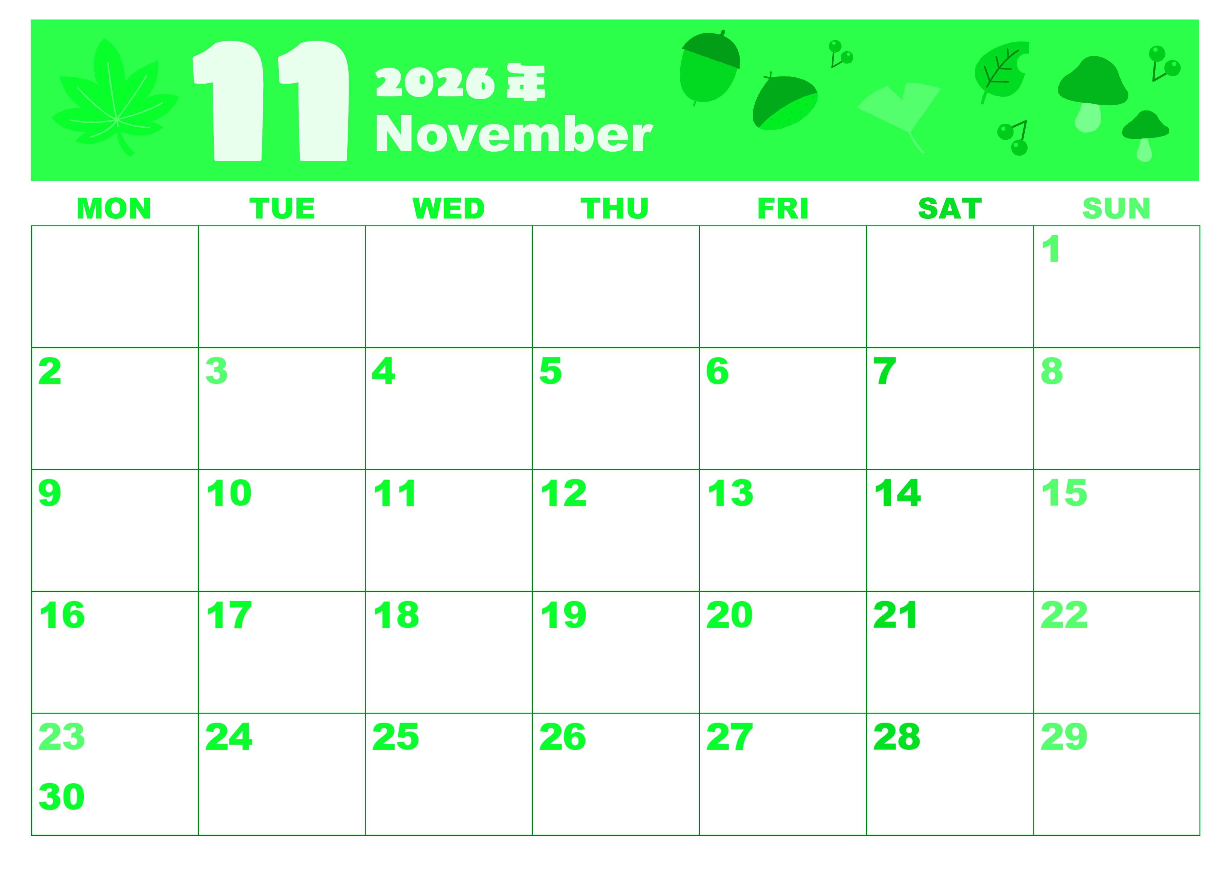 2026年11月横型月曜始まりの無料テンプレートグリーンのカレンダーです。どんぐりころころどんぐりこ♪秋の雰囲気をかわいいテイストでポップに描き上げた月曜始まりの精度が高いイラストグリーンのカレンダーです。(2026-00921101)