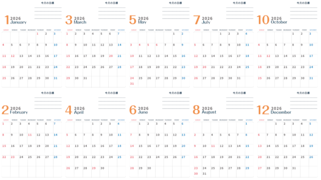 2026年3月縦型日曜始まりの無料テンプレートグリーンのカレンダーです。スケジュール記入欄には色分けされている曜日が分かりやすい日付が印字されている使いやすいグリーンのカレンダーです。イラストもシンプルかつかわいいものとなっています。(2026-00930310)