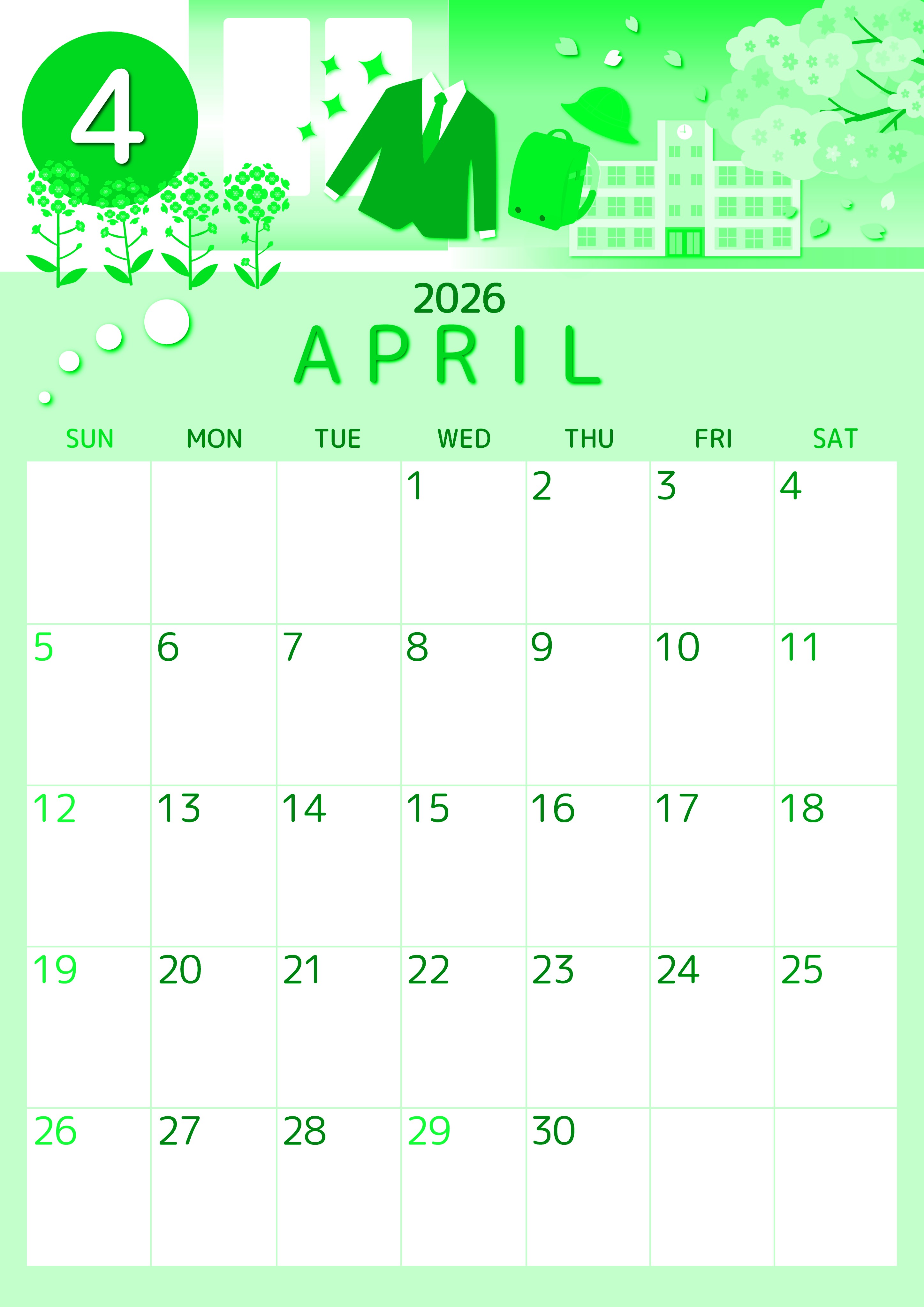 2026年4月縦型日曜始まり 入学式イラストのかわいいA4無料グリーンのカレンダー(2026-00930410)
