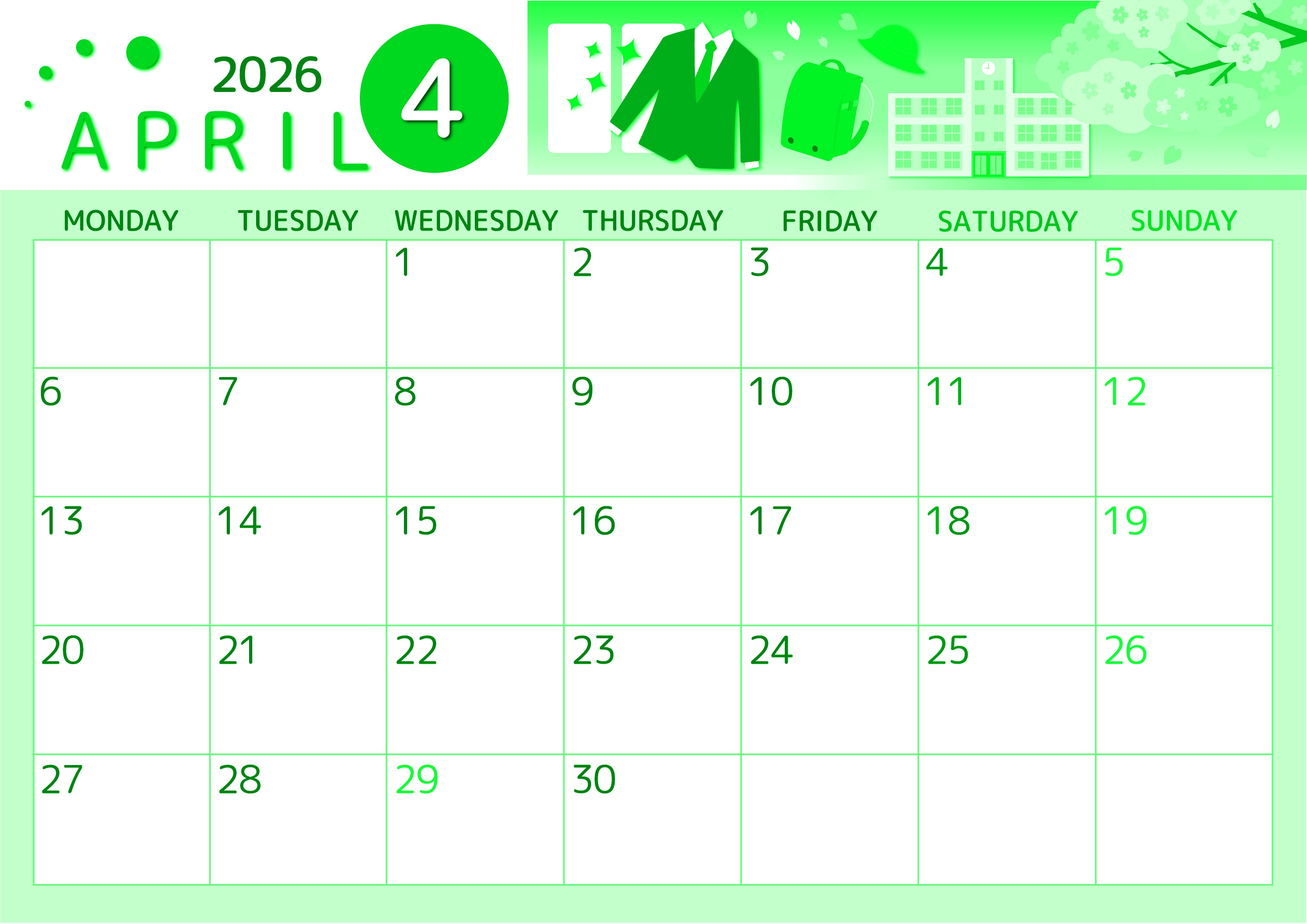 2026年4月横型月曜始まり 入学式イラストのかわいいA4無料グリーンのカレンダー(2026-00930401)