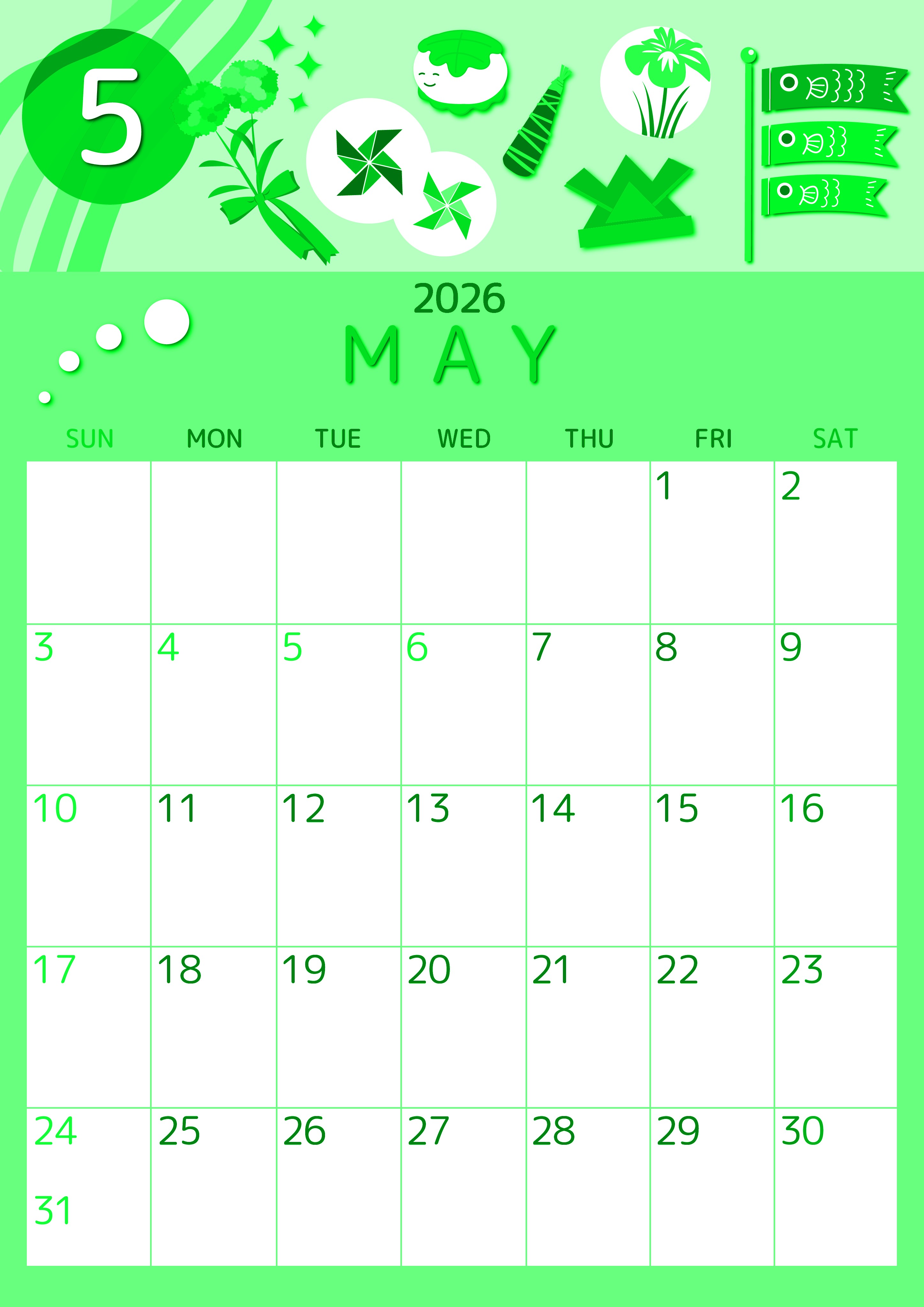 2026年5月縦型日曜始まりの無料テンプレートグリーンのカレンダーです。5月はイベントで大忙しになりがちです。そのような繁忙期に行事の管理をしやすいグリーンのカレンダーをおすすめします。かわいいデザインのイラストも魅力的です。(2026-00930510)