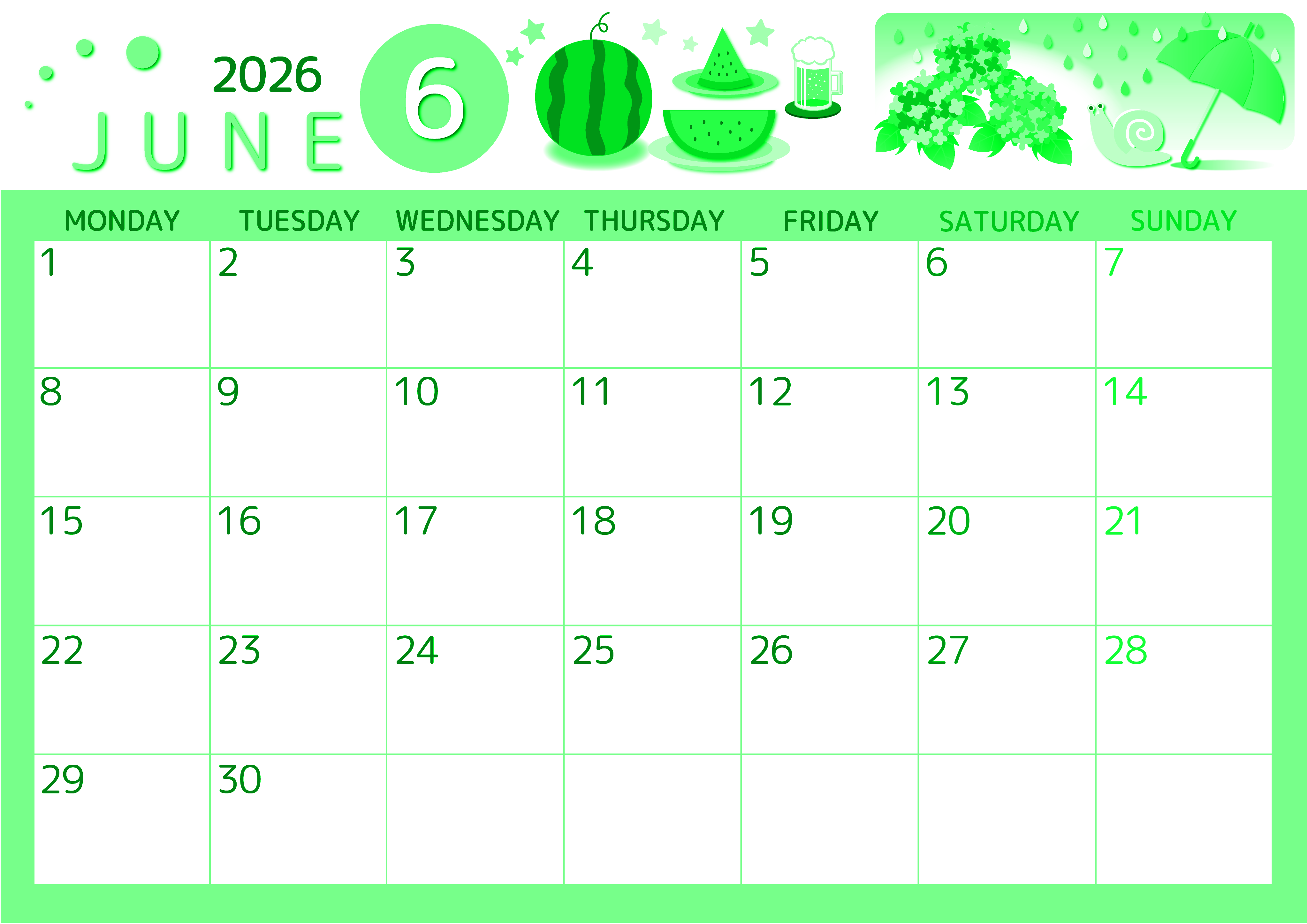 2026年6月横型月曜始まりの無料テンプレートグリーンのカレンダーです。月曜始まりでA4サイズのグリーンのカレンダーです。すいかと梅雨をモチーフにしたイラストがかわいいのでスケジュールを立てるのが楽しくなります。(2026-00930601)
