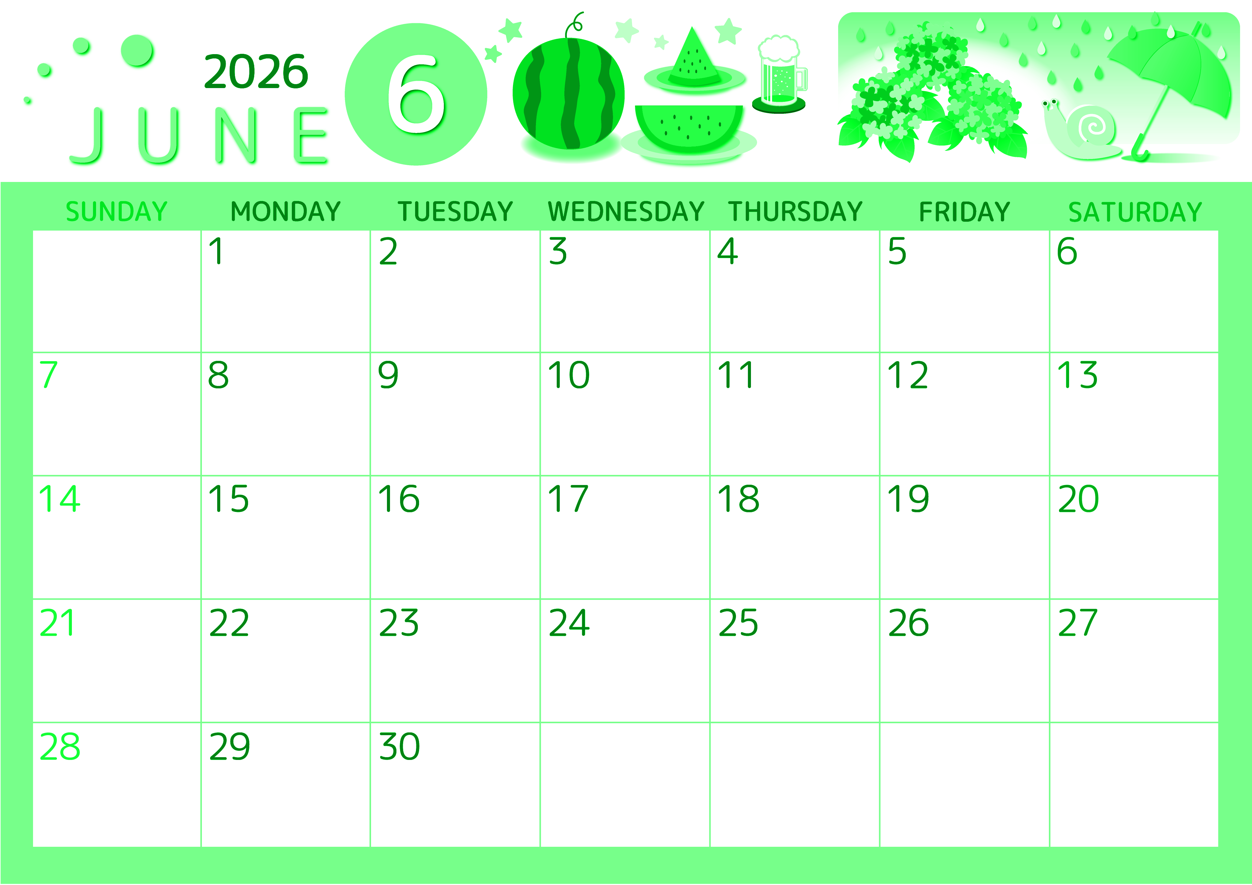 2026年6月横型日曜始まりの無料テンプレートグリーンのカレンダーです。すいかとビールがおいしそうで飲食したくなるようなかわいいイラストのグリーンのカレンダーです。いろいろなアイテムがちりばめられているのでキュートです。(2026-00930600)