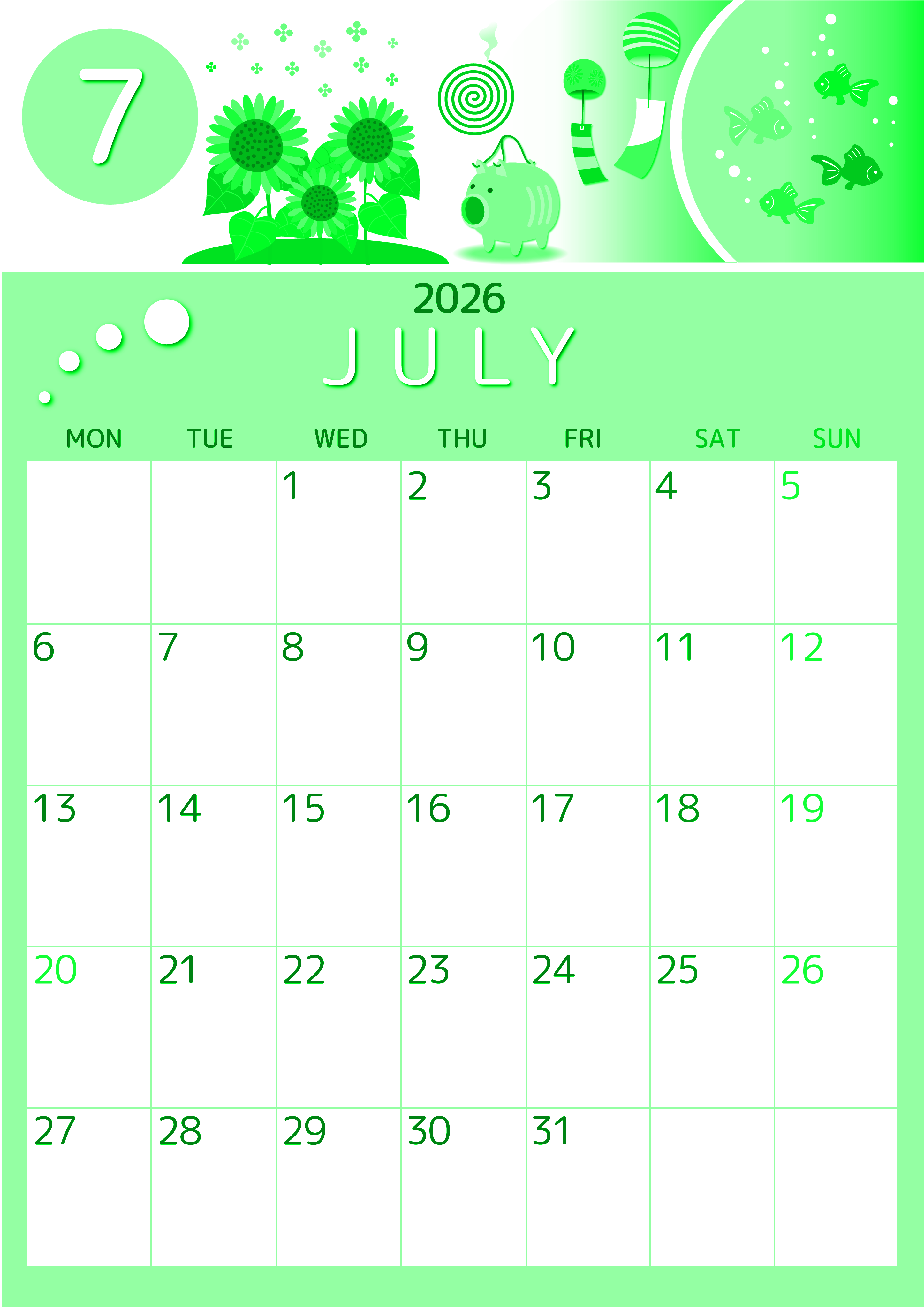 2026年7月縦型月曜始まり 蚊取り線香イラストのかわいいA4無料グリーンのカレンダー(2026-00930711)