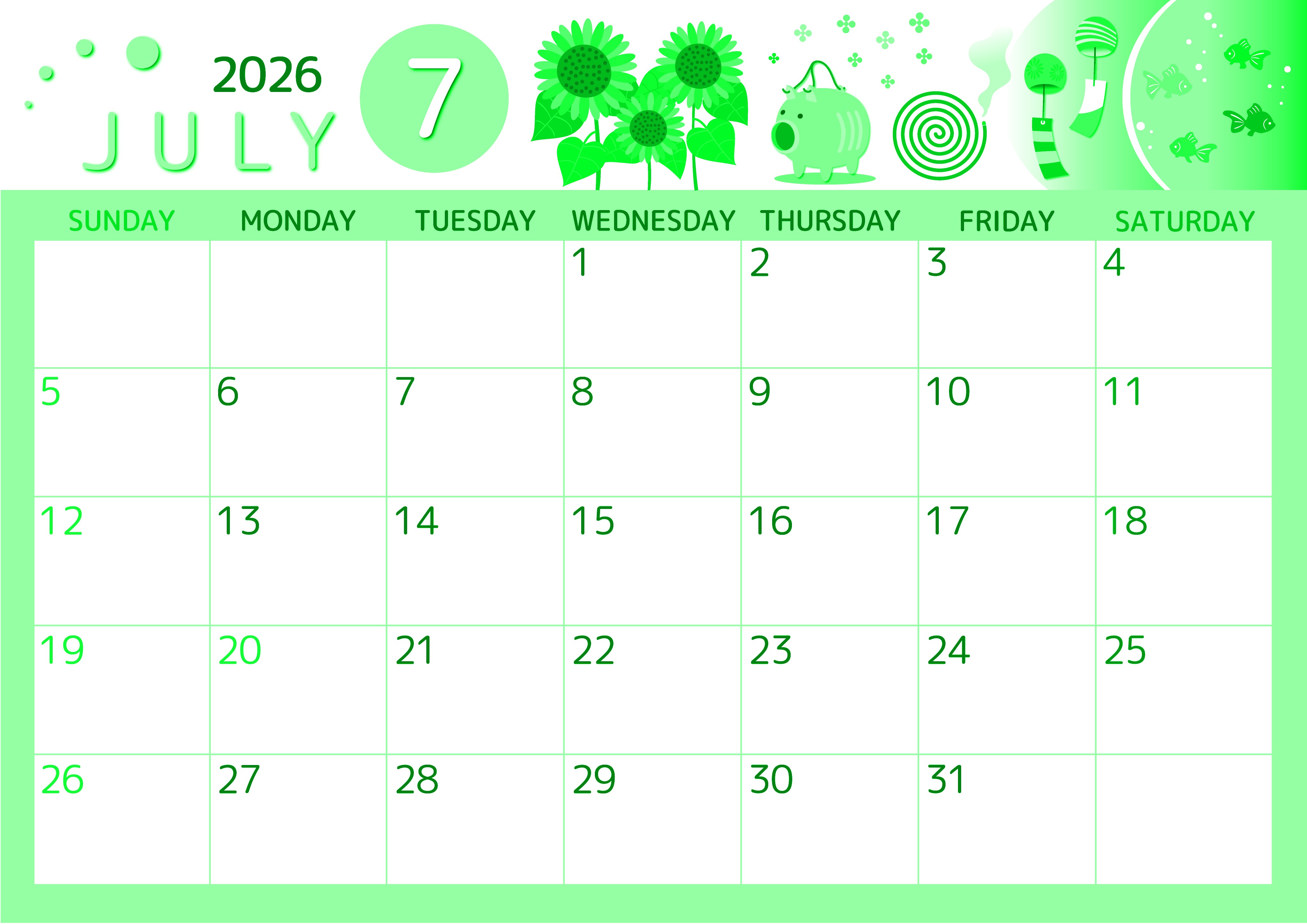 2026年7月横型日曜始まりの無料テンプレートグリーンのカレンダーです。ヒマワリや風鈴や蚊取り線香と夏といえばコレといったアイテムが目白押しの贅沢でかわいいイラストが描かれたグリーンのカレンダーはダウンロードが無料です。(2026-00930700)