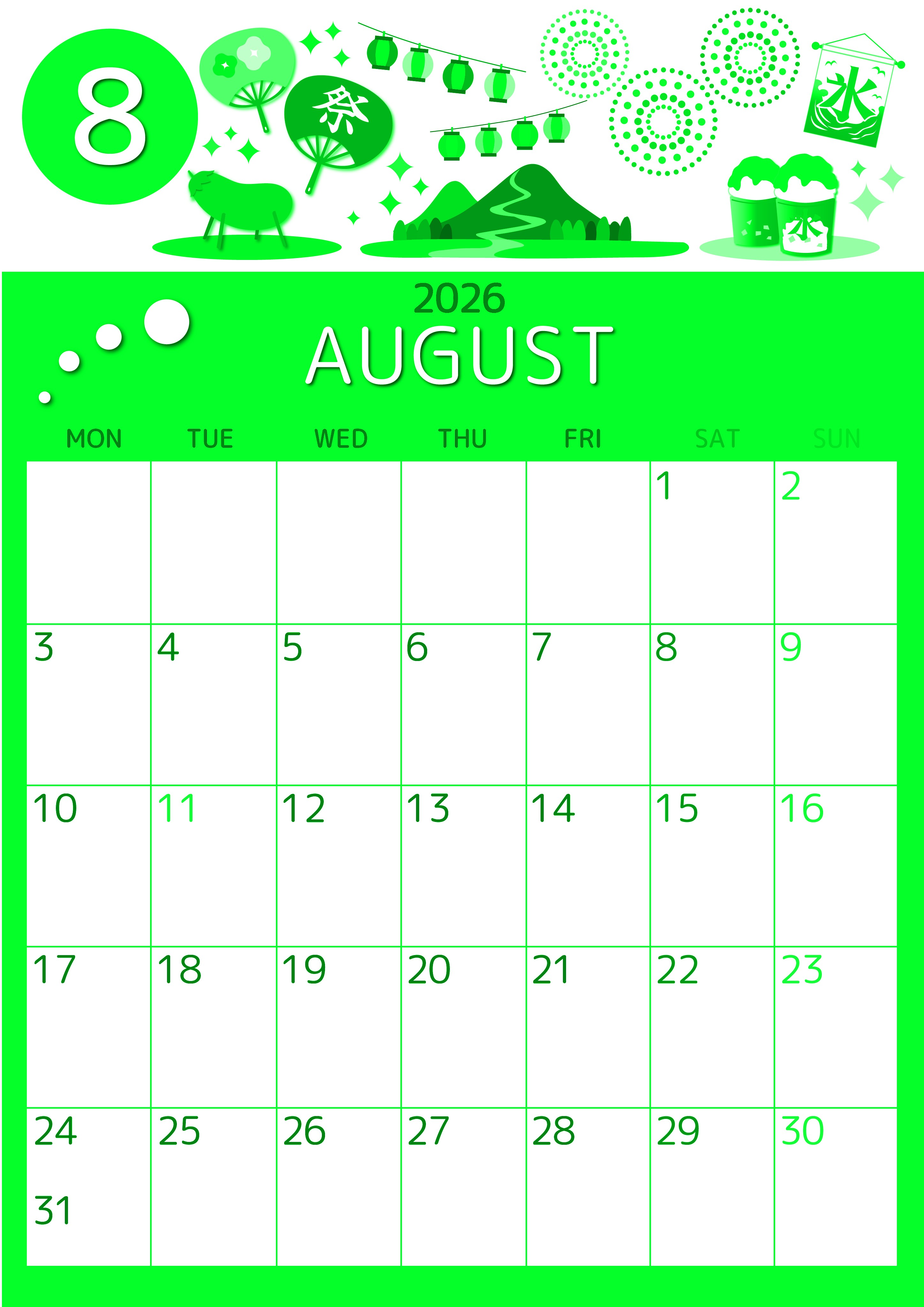 2026年8月縦型月曜始まりの無料テンプレートグリーンのカレンダーです。月曜始まりであり縦型なので壁に貼るのに丁度良いサイズのグリーンのカレンダーです。かわいいイラストも描かれており、夏祭りに行きたくなるようなテイストとなっています。(2026-00930811)