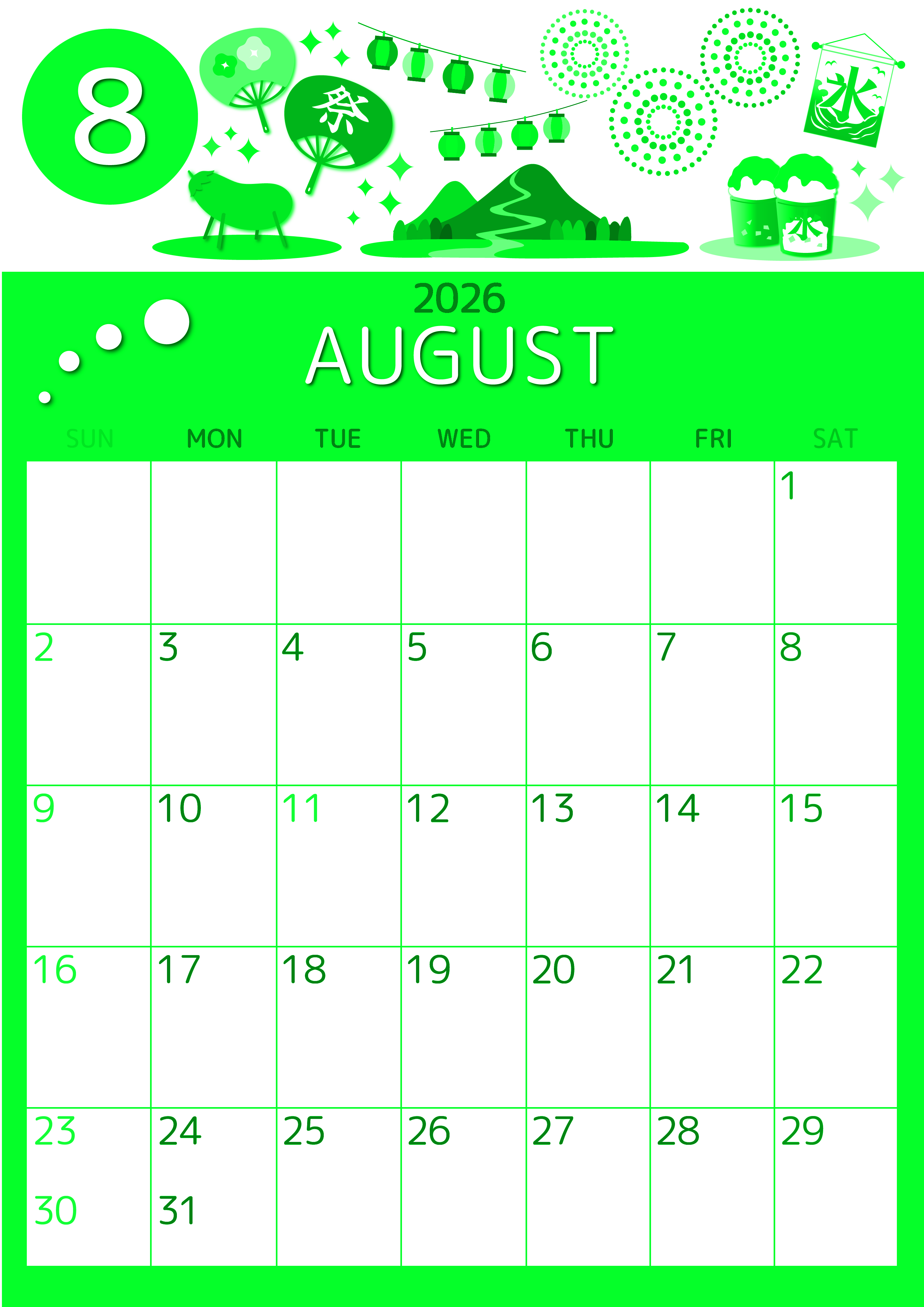2026年8月縦型日曜始まり 夏祭りイラストのかわいいA4無料グリーンのカレンダー(2026-00930810)
