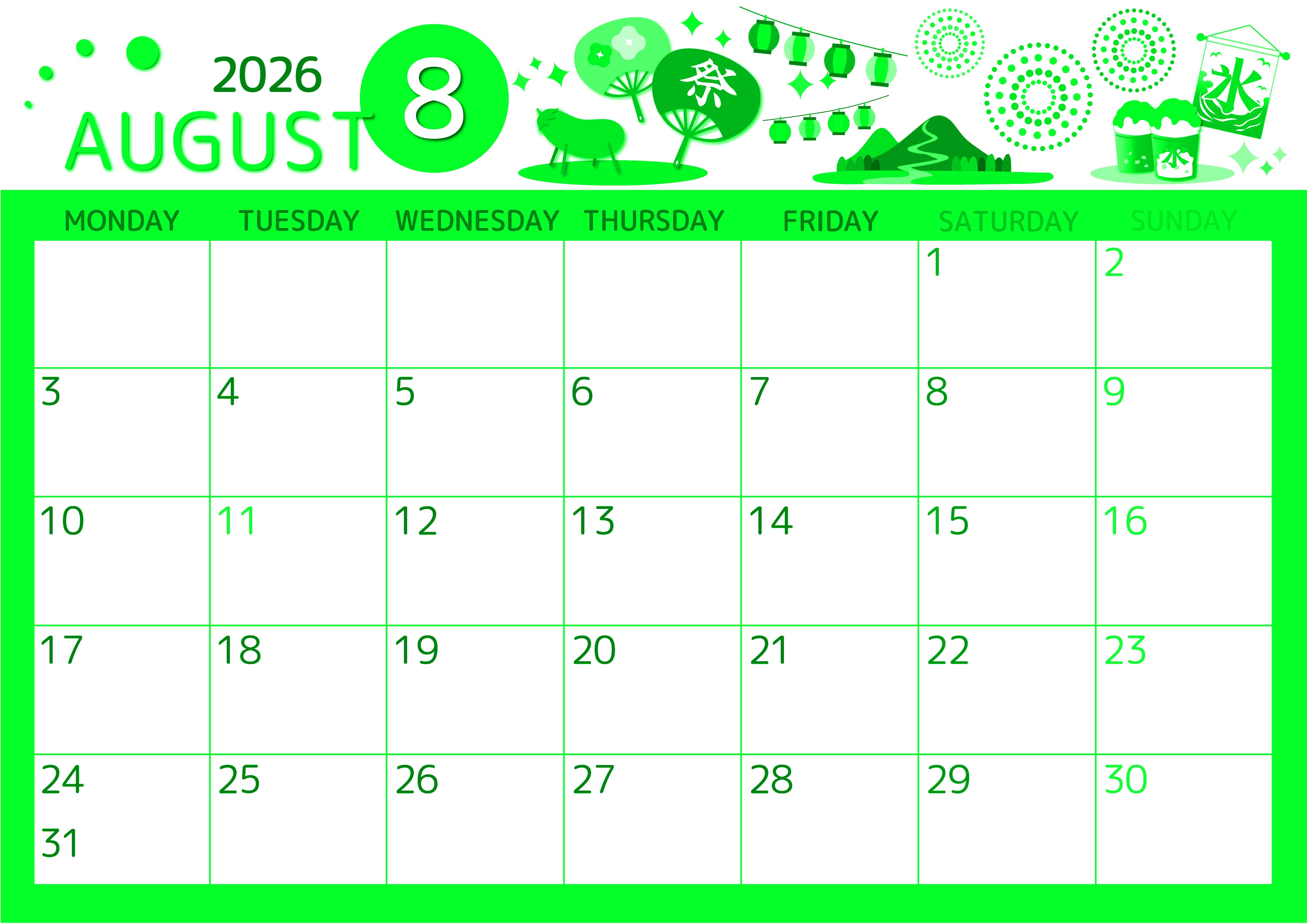 2026年8月横型月曜始まりの無料テンプレートグリーンのカレンダーです。月曜始まりで曜日ごとに色分けがされている利便性が高いグリーンのカレンダーです。かわいいイラストのテーマは夏祭りで賑やかさが伝わってくるような雰囲気です。(2026-00930801)
