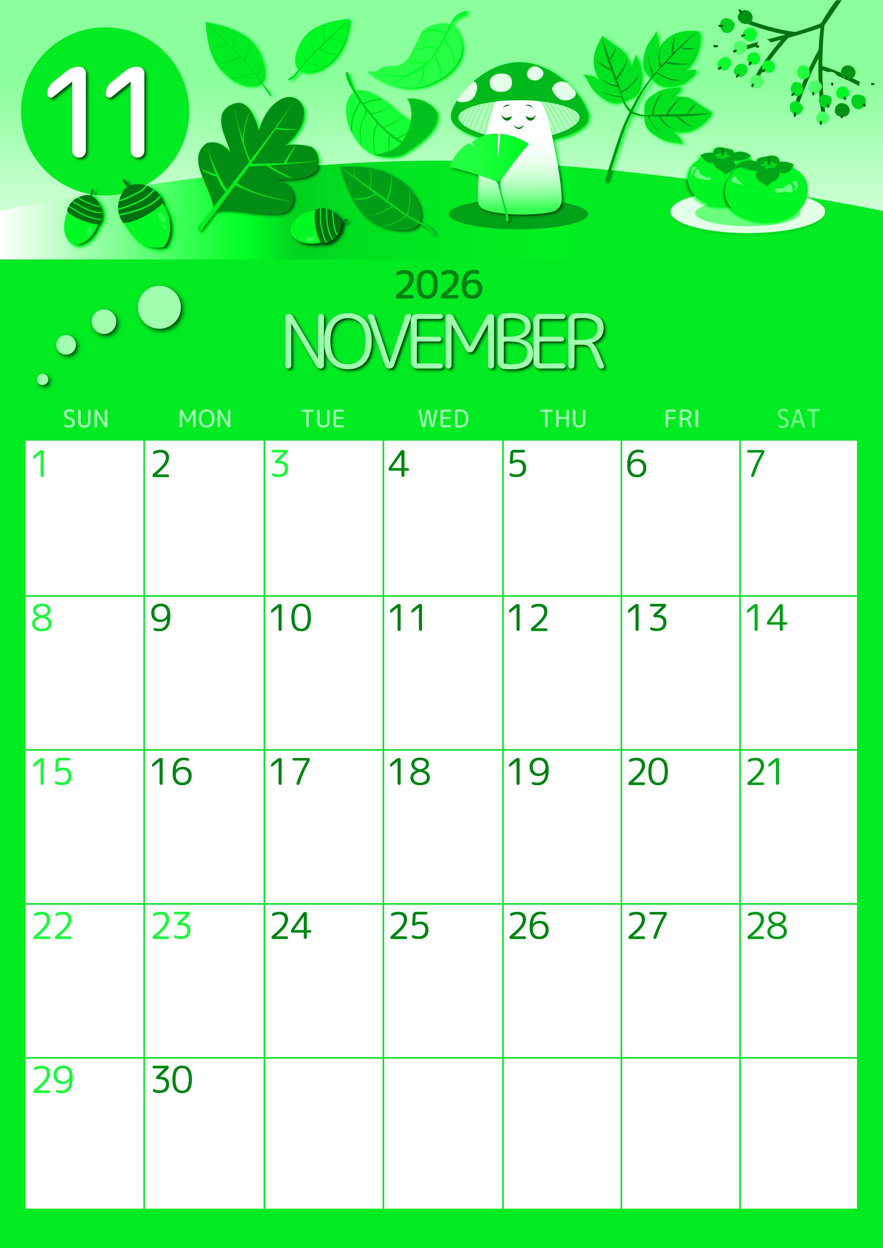 2026年・無料のカレンダーテンプレート 2026年11月縦型日曜始まり きのこイラストのかわいいA4無料グリーンのカレンダー(2026-00931110) 素材状デザイン王 2025年4月5日 2026年11月縦型日曜始まりの無料テンプレートグリーンのカレンダーです。もみじやいちょうにかこまれて休憩をしているきのこのイラストがとてもかわいいです。縦向きで印刷をするだけですぐ使えます。(2026-00931110) 11月 縦型のカレンダー 日曜始まり グリーン カレンダーデザイン-0093