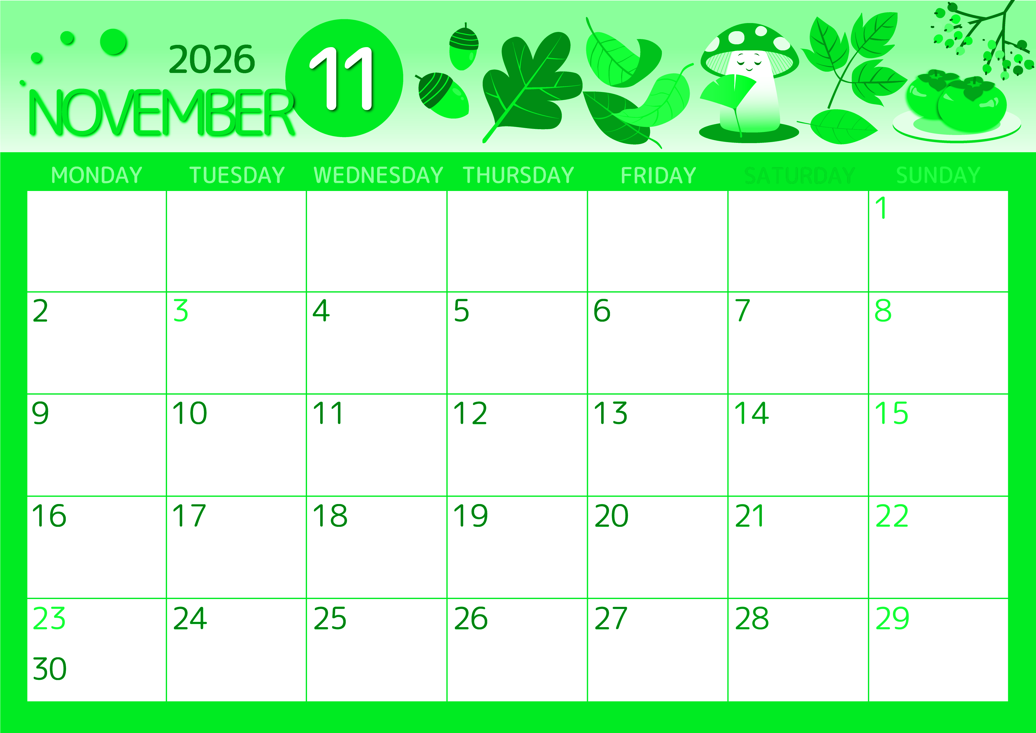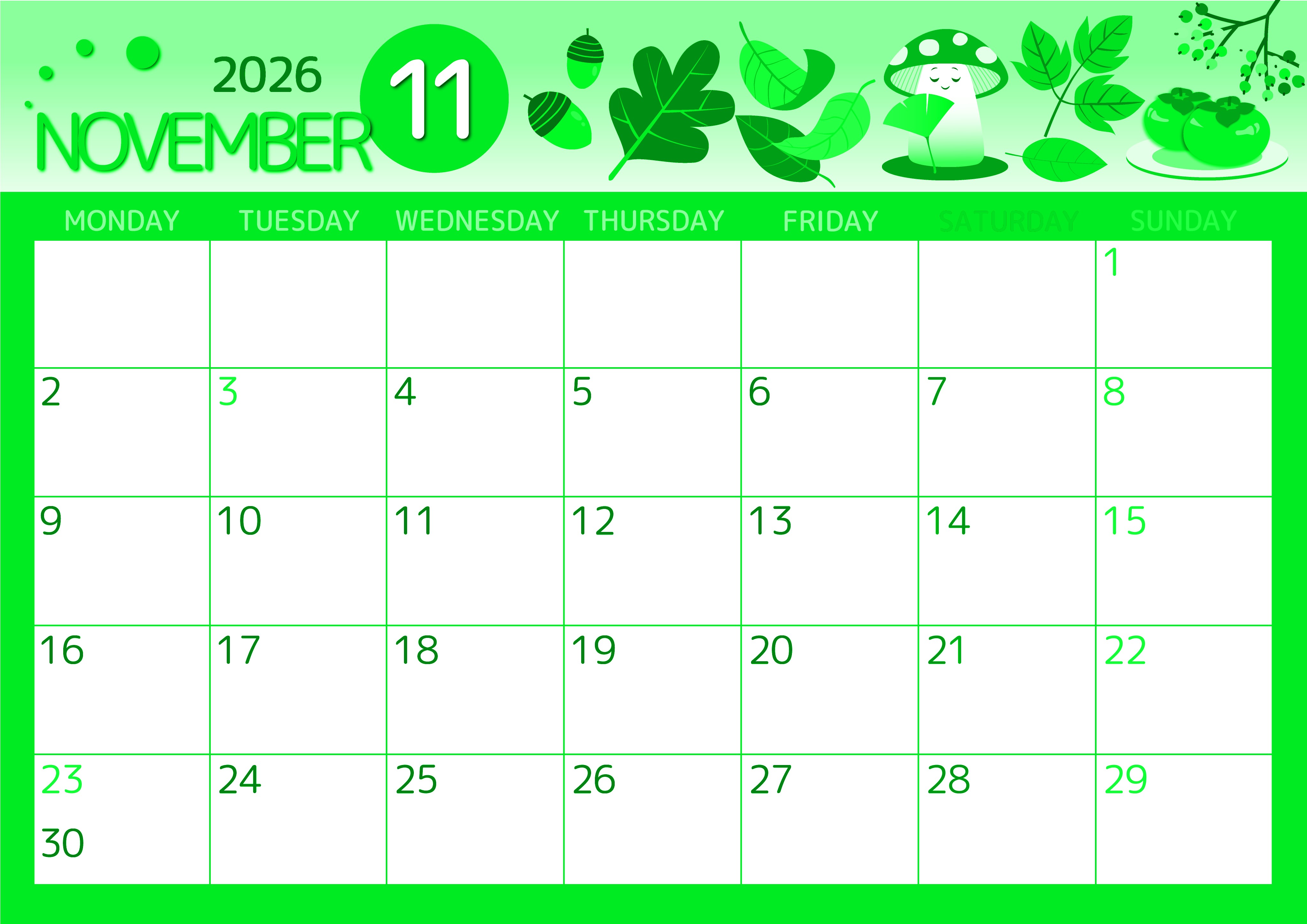 2026年・無料のカレンダーテンプレート 2026年11月横型月曜始まり きのこイラストのかわいいA4無料グリーンのカレンダー(2026-00931101) 素材状デザイン王 2025年4月5日 2026年11月横型月曜始まりの無料テンプレートグリーンのカレンダーです。きのこが癒し系のかわいいイラストです。月曜始まりでご家族やお子様の予定を立てるのに向いているレイアウトになっています。(2026-00931101) 11月 横型のカレンダー 月曜始まり グリーン カレンダーデザイン-0093
