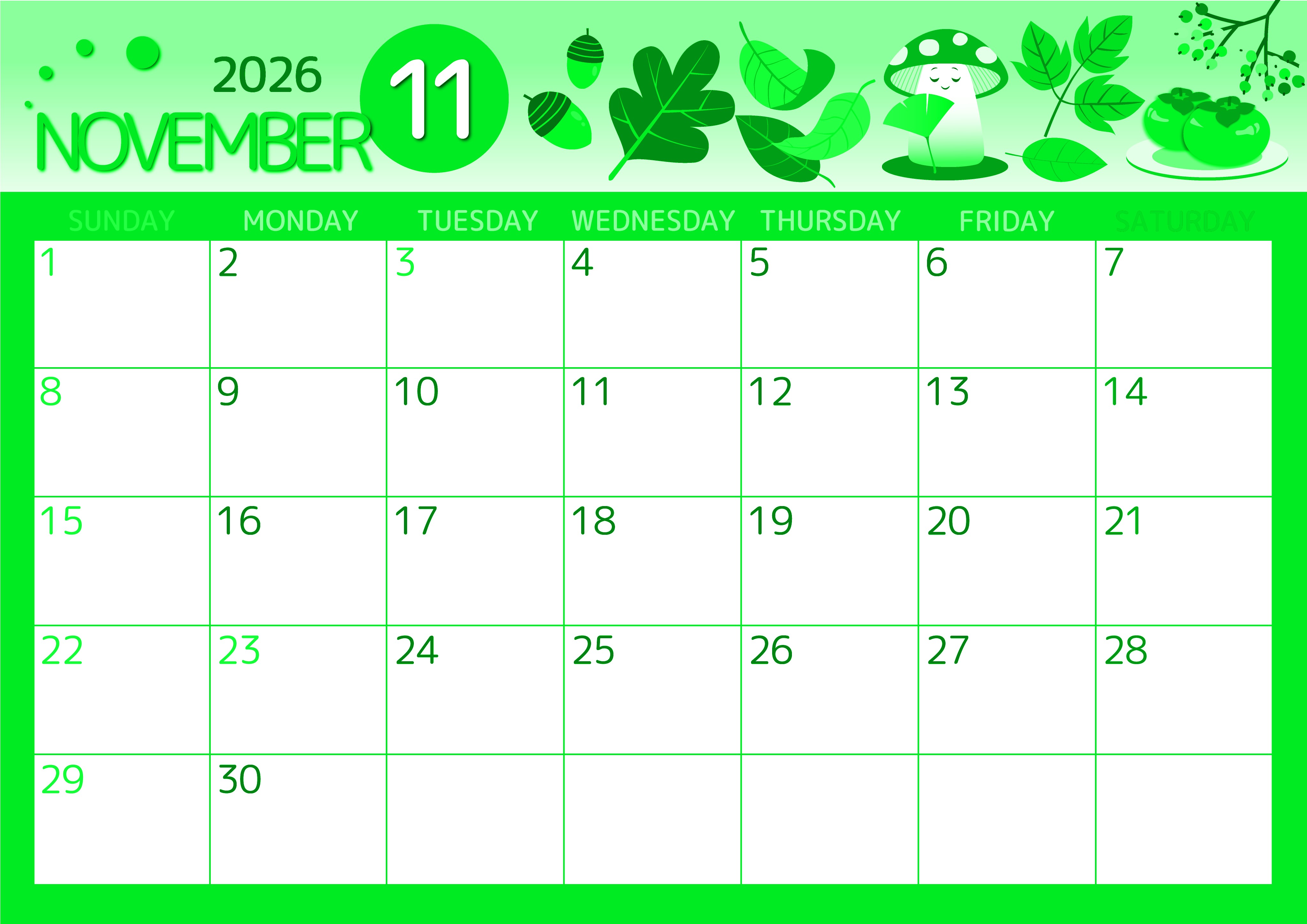 2026年11月横型日曜始まりの無料テンプレートグリーンのカレンダーです。キノコが主役のイラストがかわいいです。グリーンのカレンダーのフレーム部分はワインレッドでしっかり囲まれているのでシックさもあります。(2026-00931100)