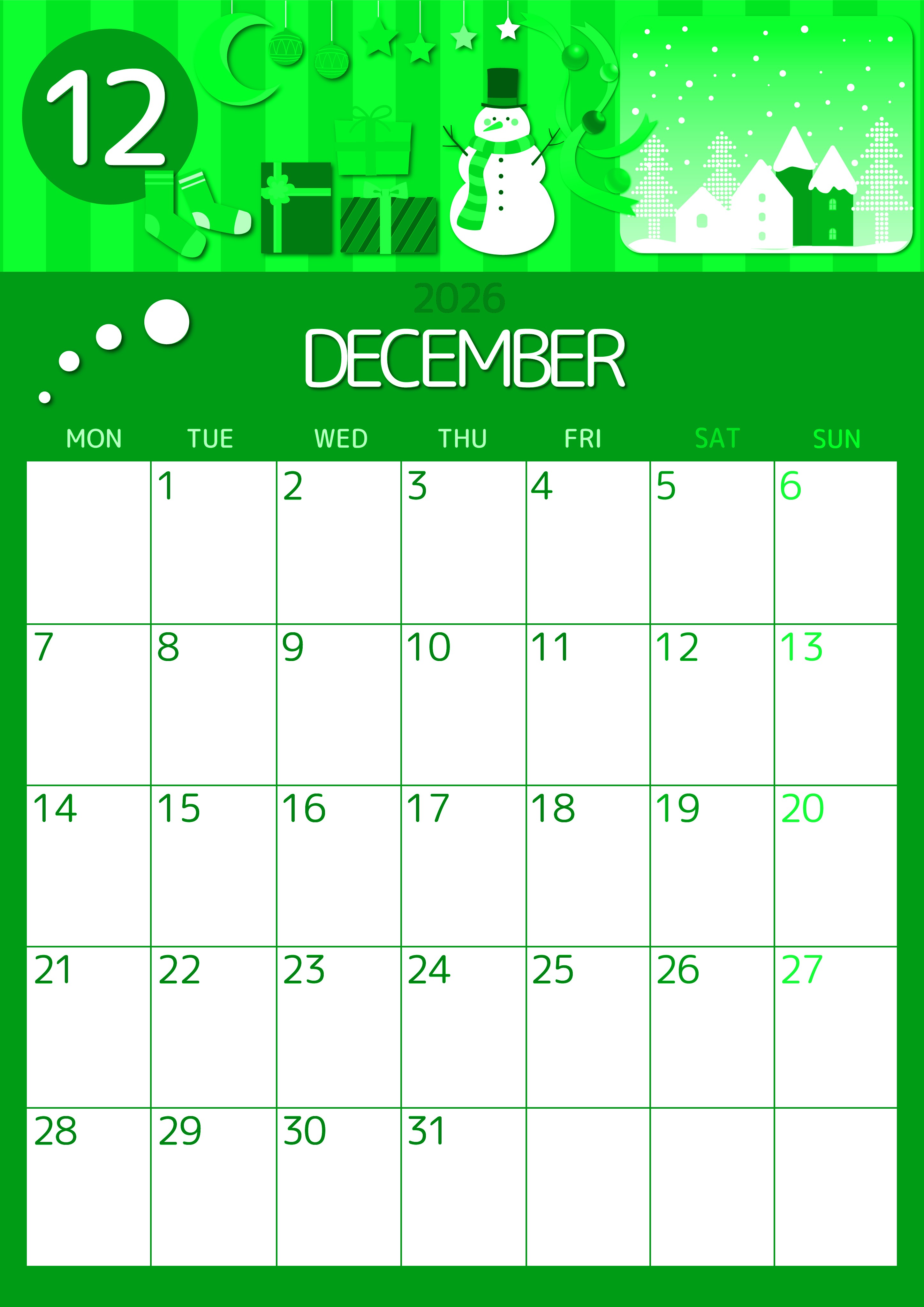 2026年12月縦型月曜始まりの無料テンプレートグリーンのカレンダーです。オーナメントの下にちょこんと佇んでいる雪だるまのイラストがかわいいです。クリスマスのプランニングのモチベーションが上がります。(2026-00931211)