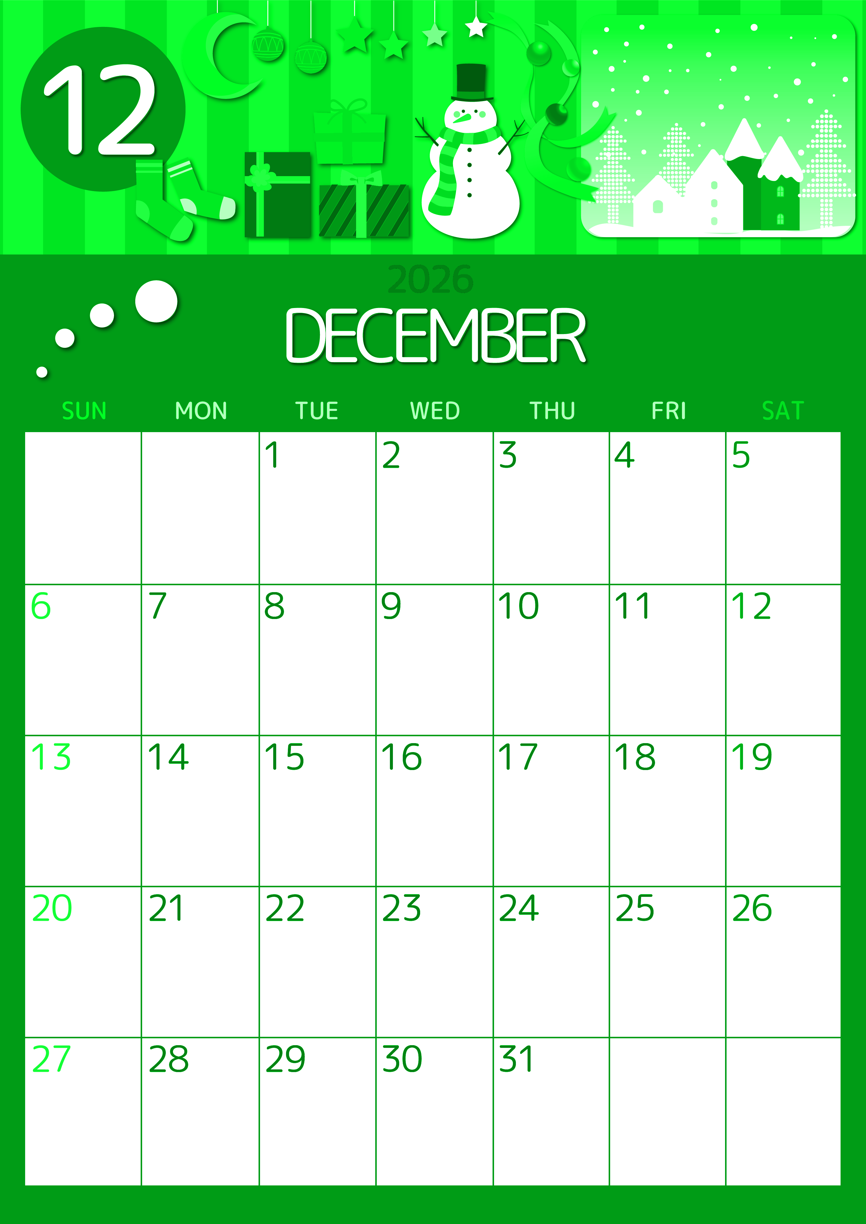 2026年12月縦型日曜始まりの無料テンプレートグリーンのカレンダーです。グリーンのカレンダーの枠は緑色でグリーンのカレンダー部分は背景が白色なので予定を記入しやすいです。イラスト部分は雪だるまがアクセントになっていてかわいいです。(2026-00931210)