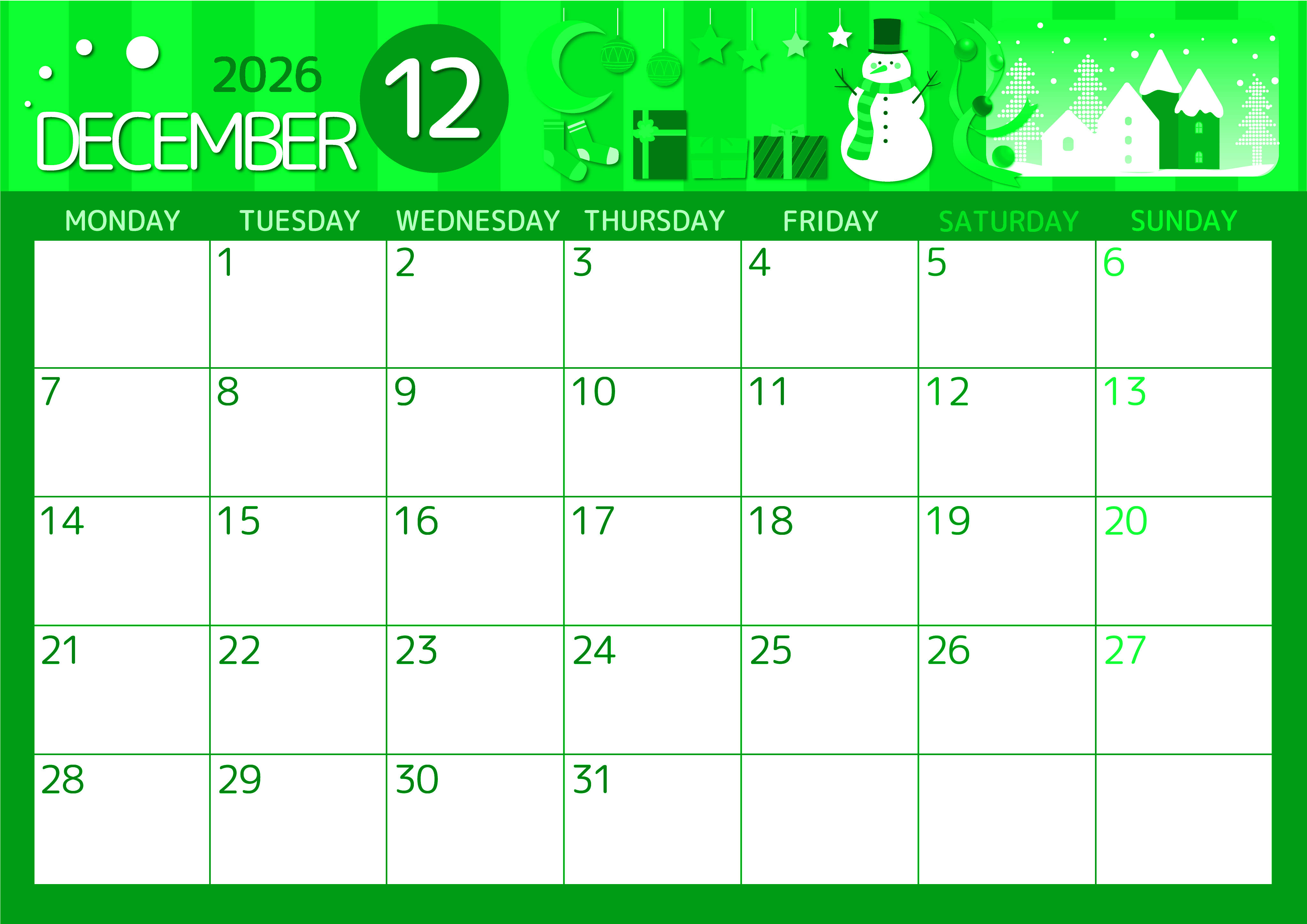 2026年12月横型月曜始まりの無料テンプレートグリーンのカレンダーです。雪だるまの白色が背景の赤色にばっちり映えるかわいいテイストが強いイラストになっています。雪景色のイラストもメリハリがあって美しいです。(2026-00931201)