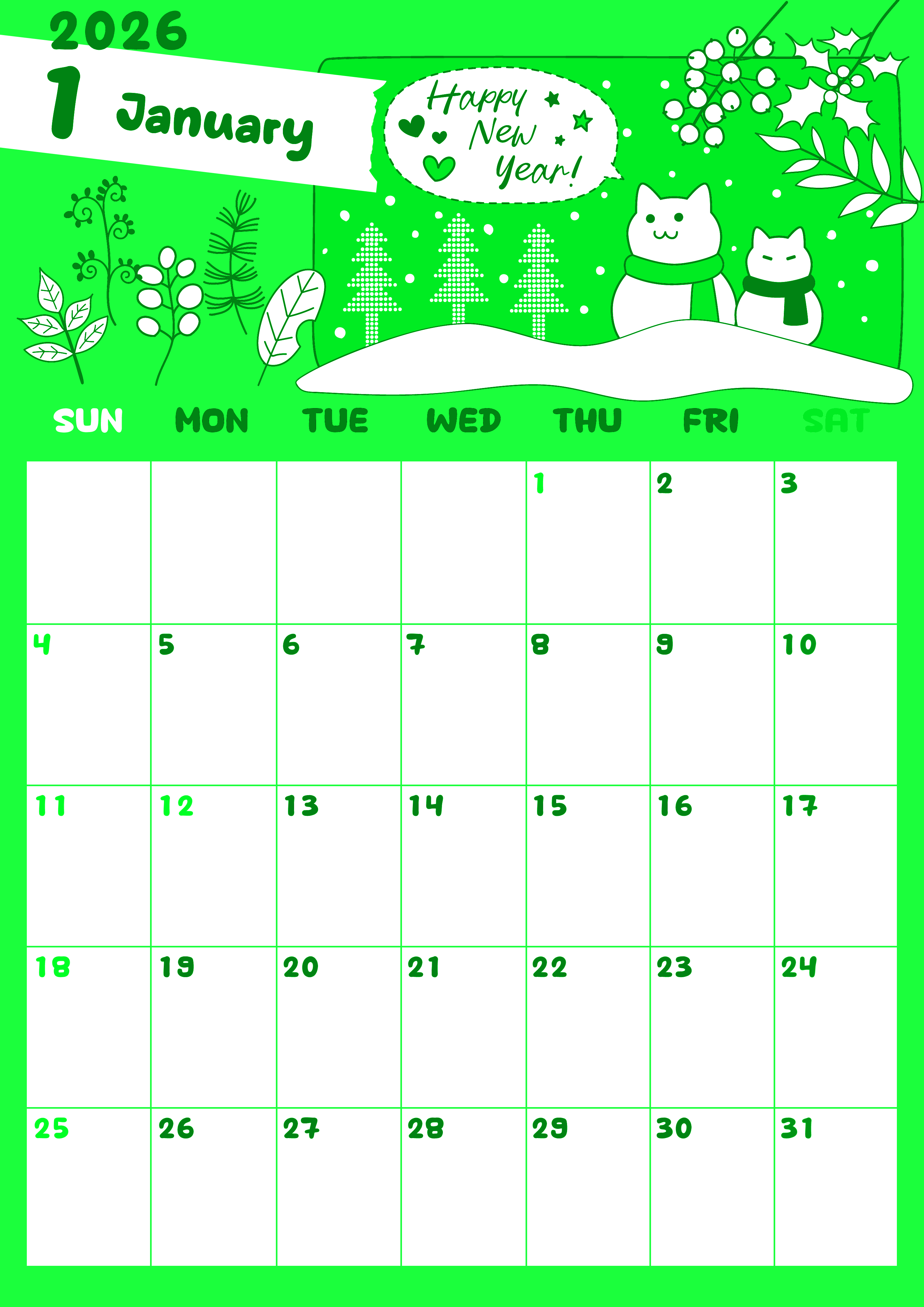2026年1月縦型日曜始まりです。枠部分は目が覚めるような鮮やかな黄色である一方で、ボタニカルテイストなモノトーンイラストとのギャップがおしゃれかわいいグリーンのカレンダーです。猫をモチーフにした雪だるまにも注目して下さい。(2026-00940110)