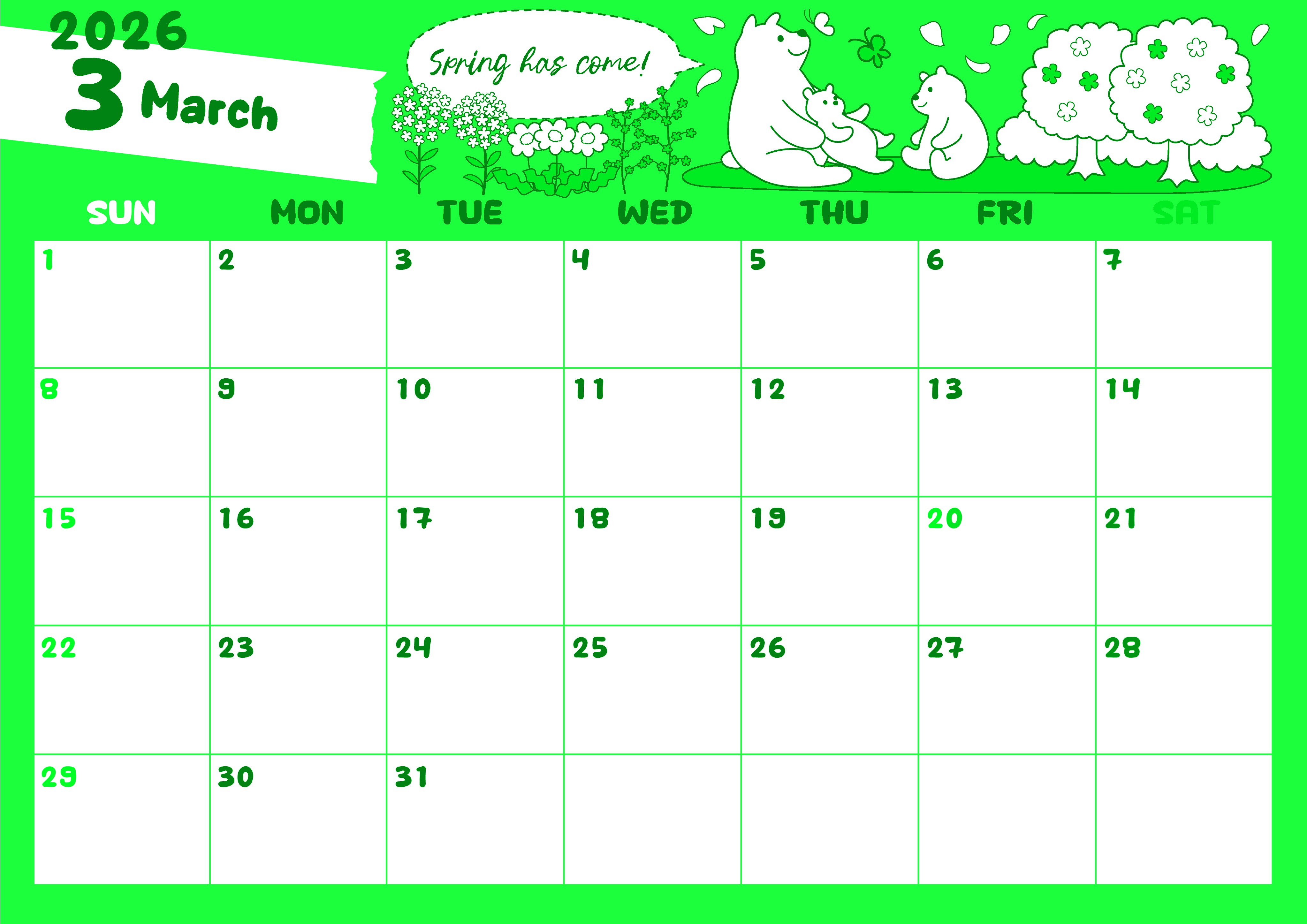 2026年3月横型日曜始まりの無料テンプレートグリーンのカレンダーです。白熊の家族が仲良しそうに戯れている様子のイラストがポップでかわいい枠でかこまれたグリーンのカレンダーです。罫線がしっかりと引かれているので子供から高齢者まで使いやすいデザインです。(2026-00940300)