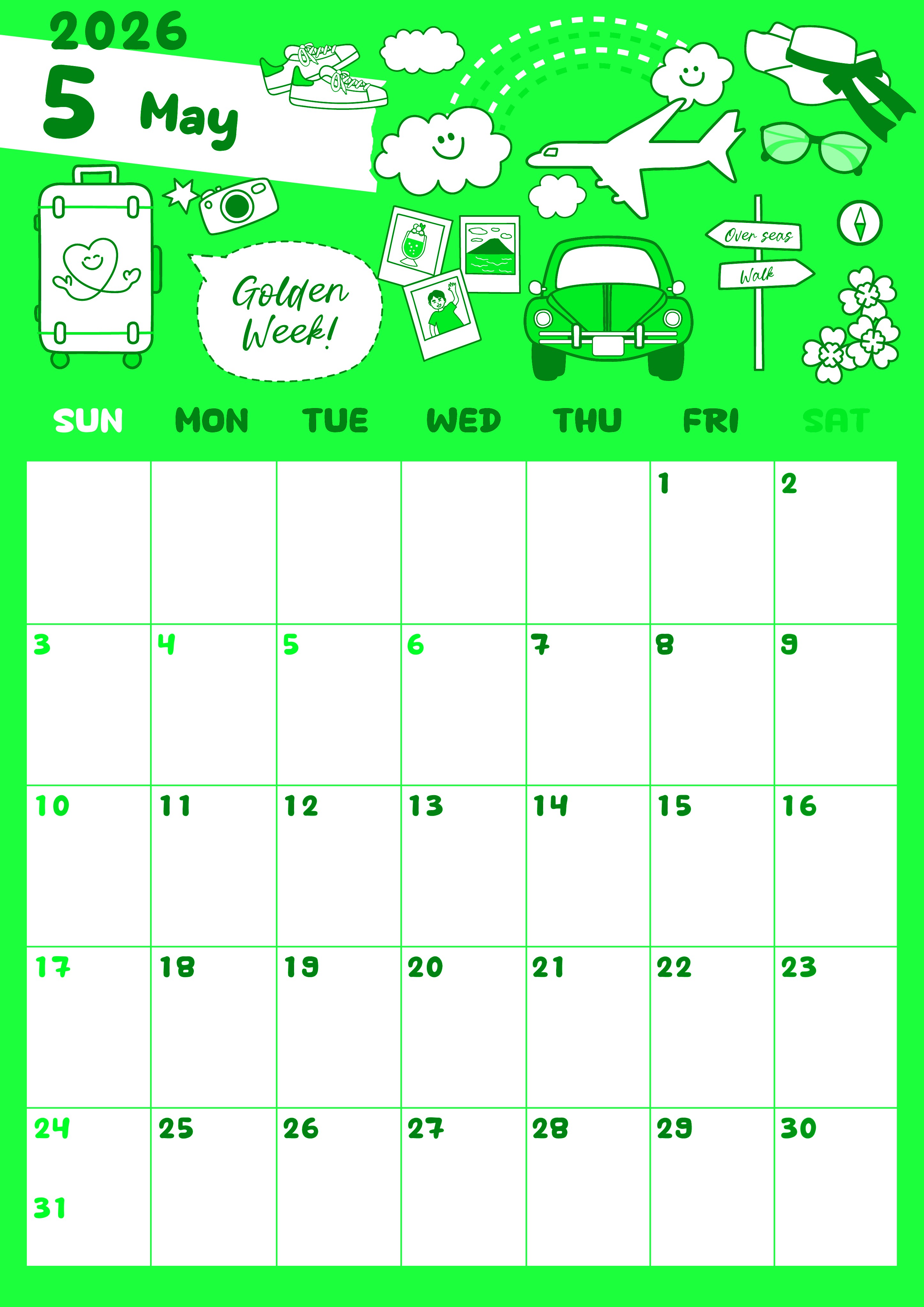 2026年5月縦型日曜始まりの無料テンプレートグリーンのカレンダーです。飛行機や車やスーツケースのイラストがGWのバケーションを連想させてくれるかわいいグリーンのカレンダーでダウンロードは無料で簡単です。(2026-00940510)