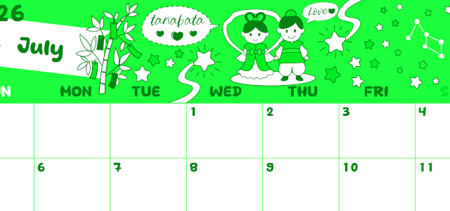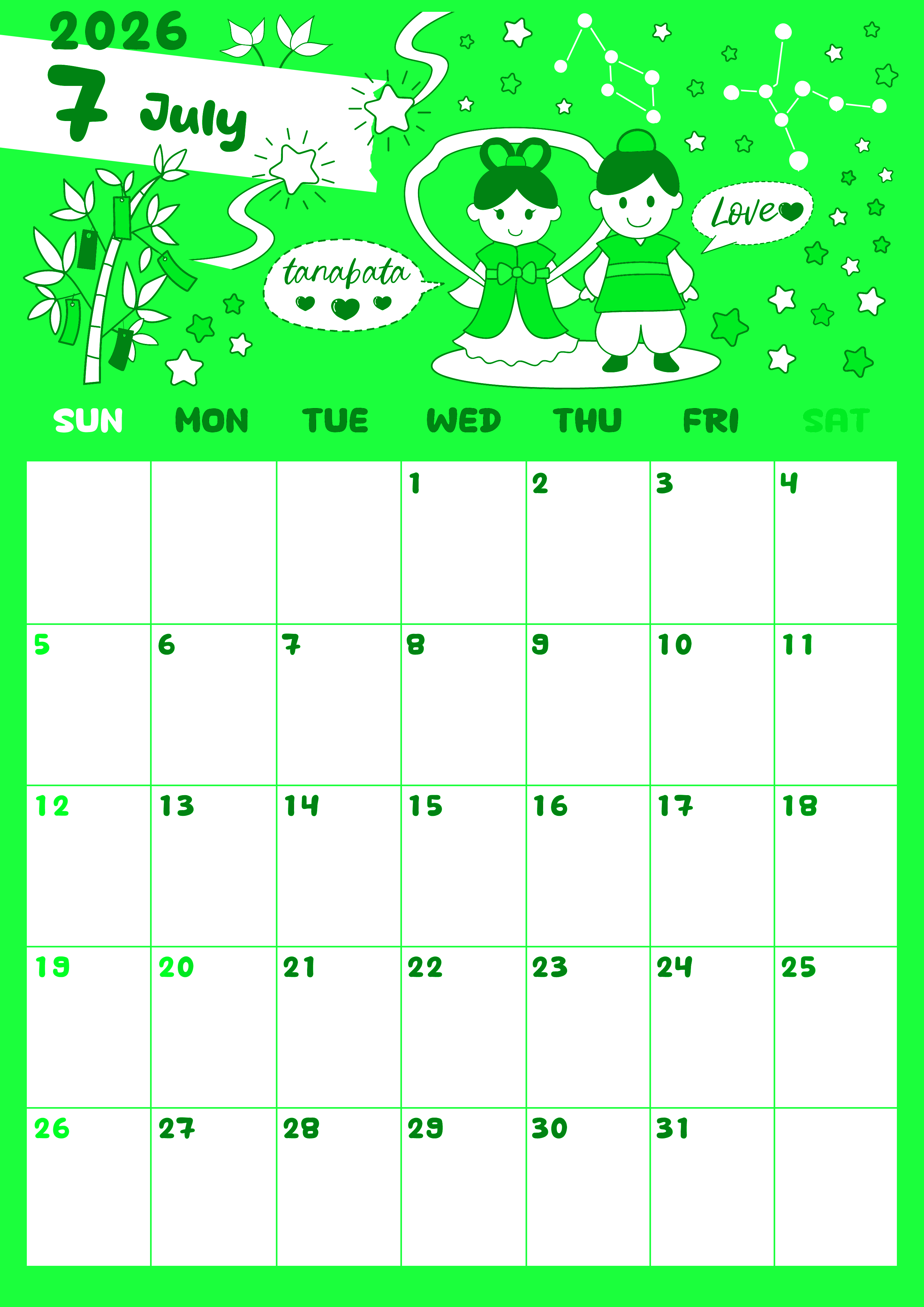2026年7月縦型日曜始まりの無料テンプレートグリーンのカレンダーです。ポップテイストが好みな人にとてもおすすめできるかわいいイラスト付きの縦向きグリーンのカレンダーです。ペンで予定を書き込みやすいようになっています。(2026-00940710)