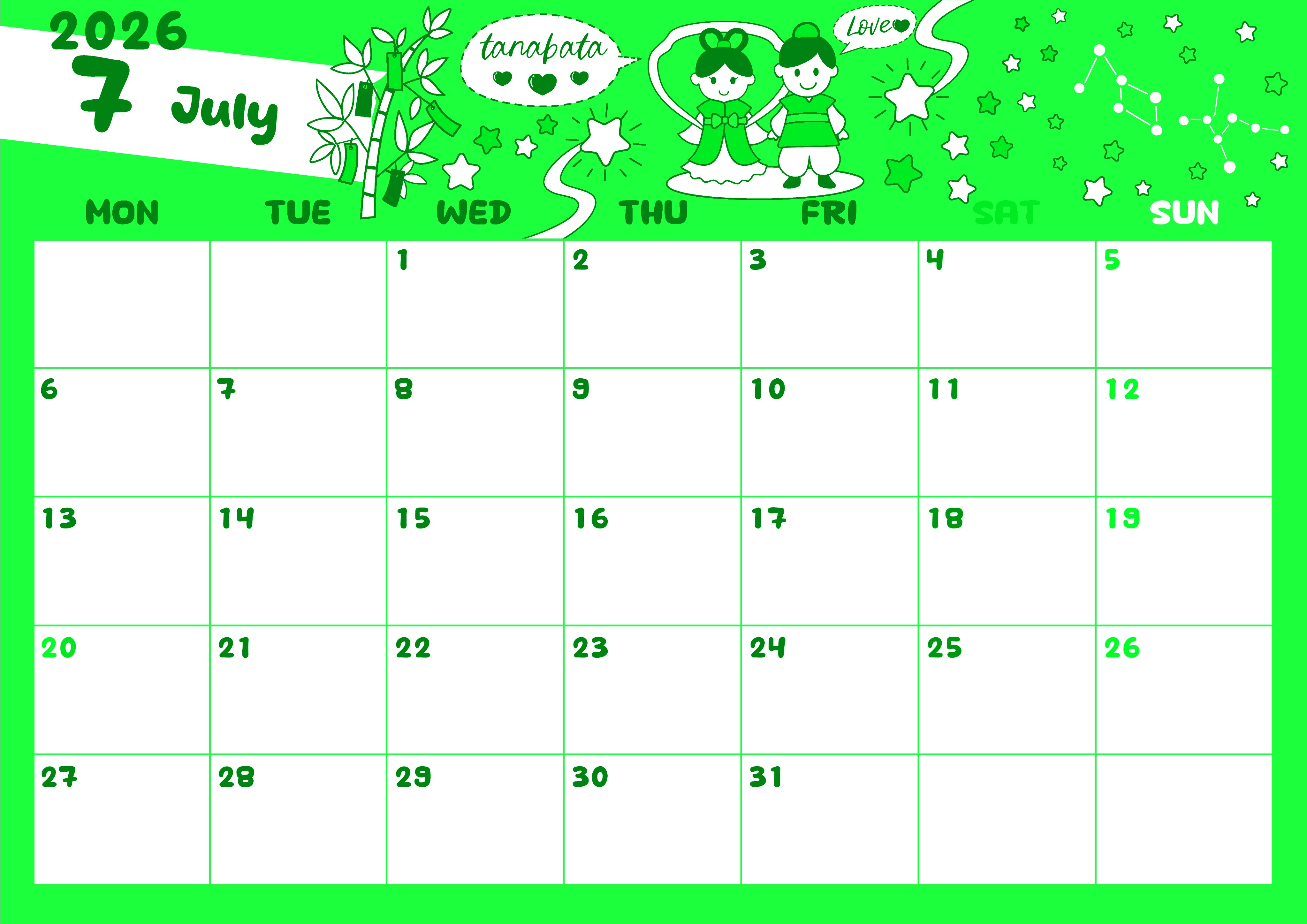 2026年7月横型月曜始まり ポップなイラストがかわいいA4無料グリーンのカレンダー(2026-00940701)