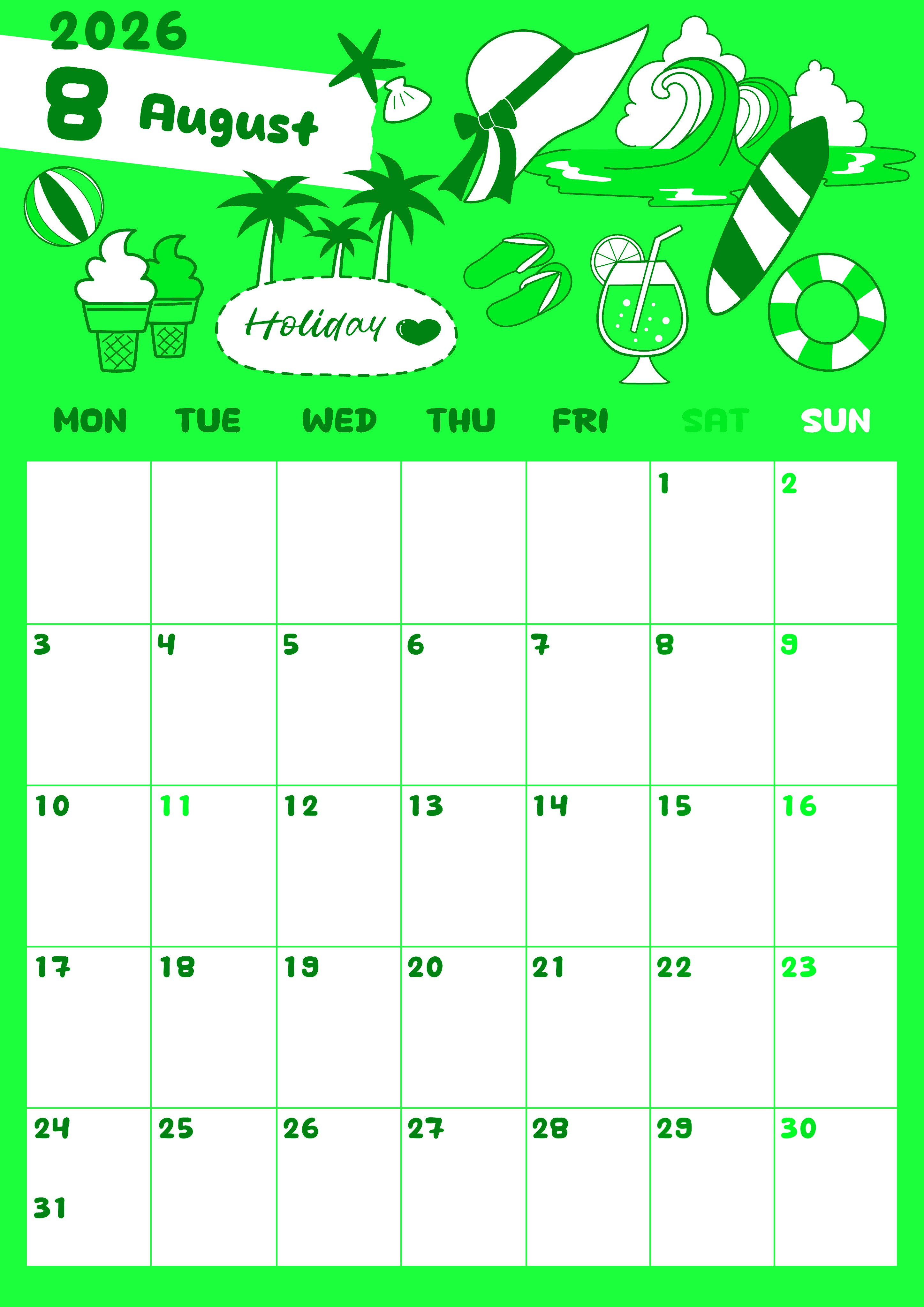 2026年8月縦型月曜始まりの無料テンプレートグリーンのカレンダーです。月曜始まりで罫線も引いてある使い勝手の良いグリーンのカレンダーには海岸の賑やかな雰囲気が伝わってくるようなかわいいポップなイラストが目白押しです。(2026-00940811)